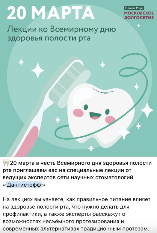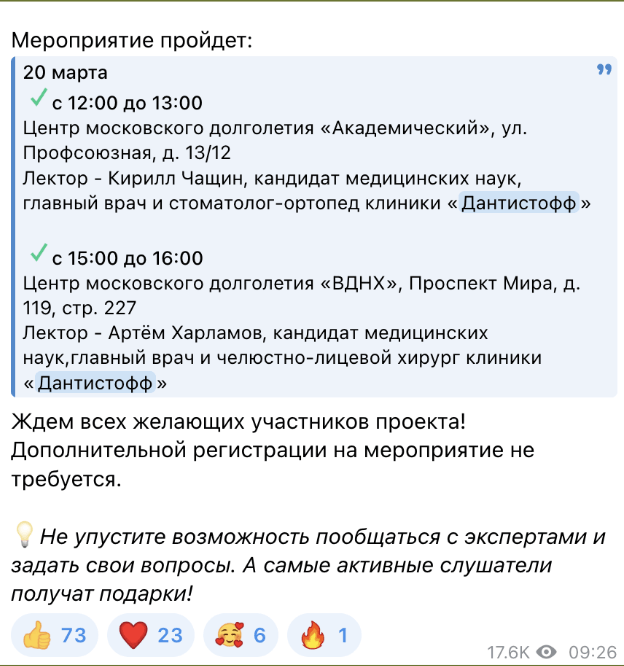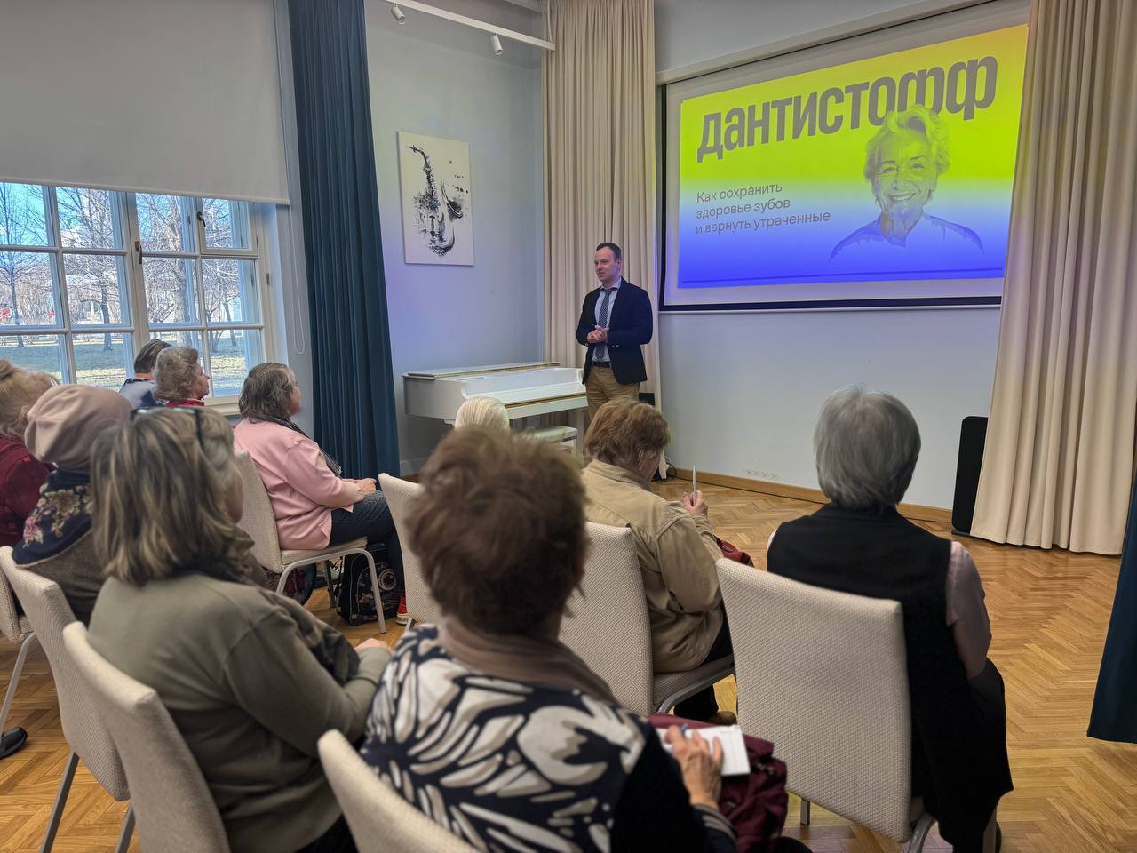 Врачи клиники прочитали лекции о здоровье полости рта для «Московского долголетия», гостям были вручены подарки от Дантистофф.