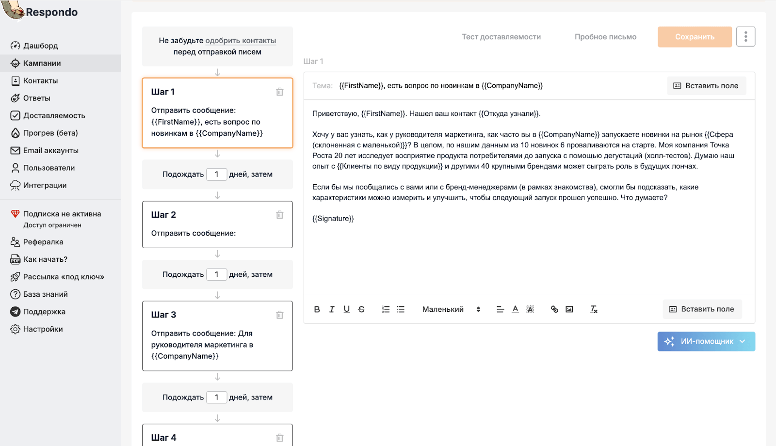 4. Для каждого сегмента подготовили уникальные цепочки писем с переменными: упоминали релевантных конкурентов, подставляли названия брендов, адаптировали оффер. Например, если компания производила молочную продукцию — мы указывали: «Работаем с Danone и Вимм-Билль-Данн. А если напитки — «Сотрудничали с Lit Energy».