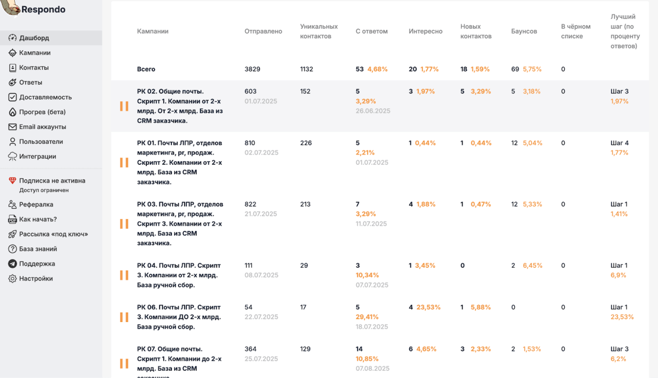 5. Запустили e-mail кампанию через Respondo, а параллельно — Telegram-аутрич.
