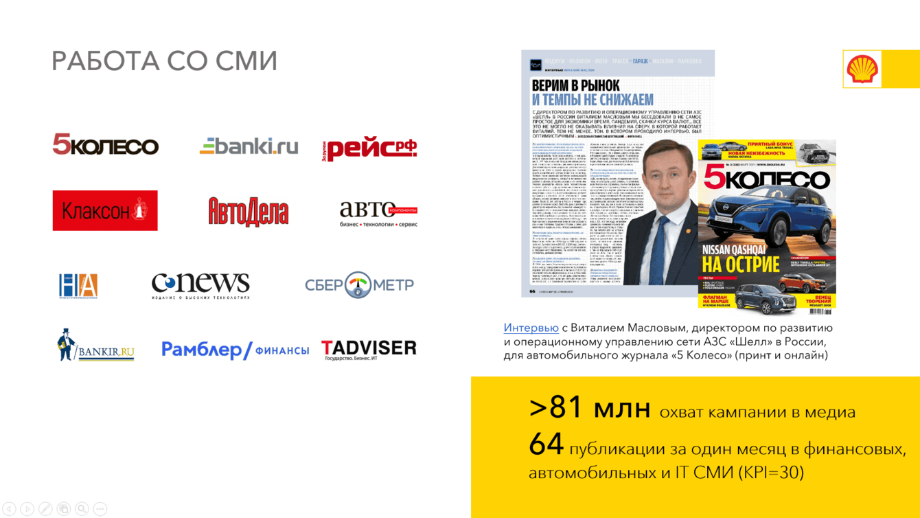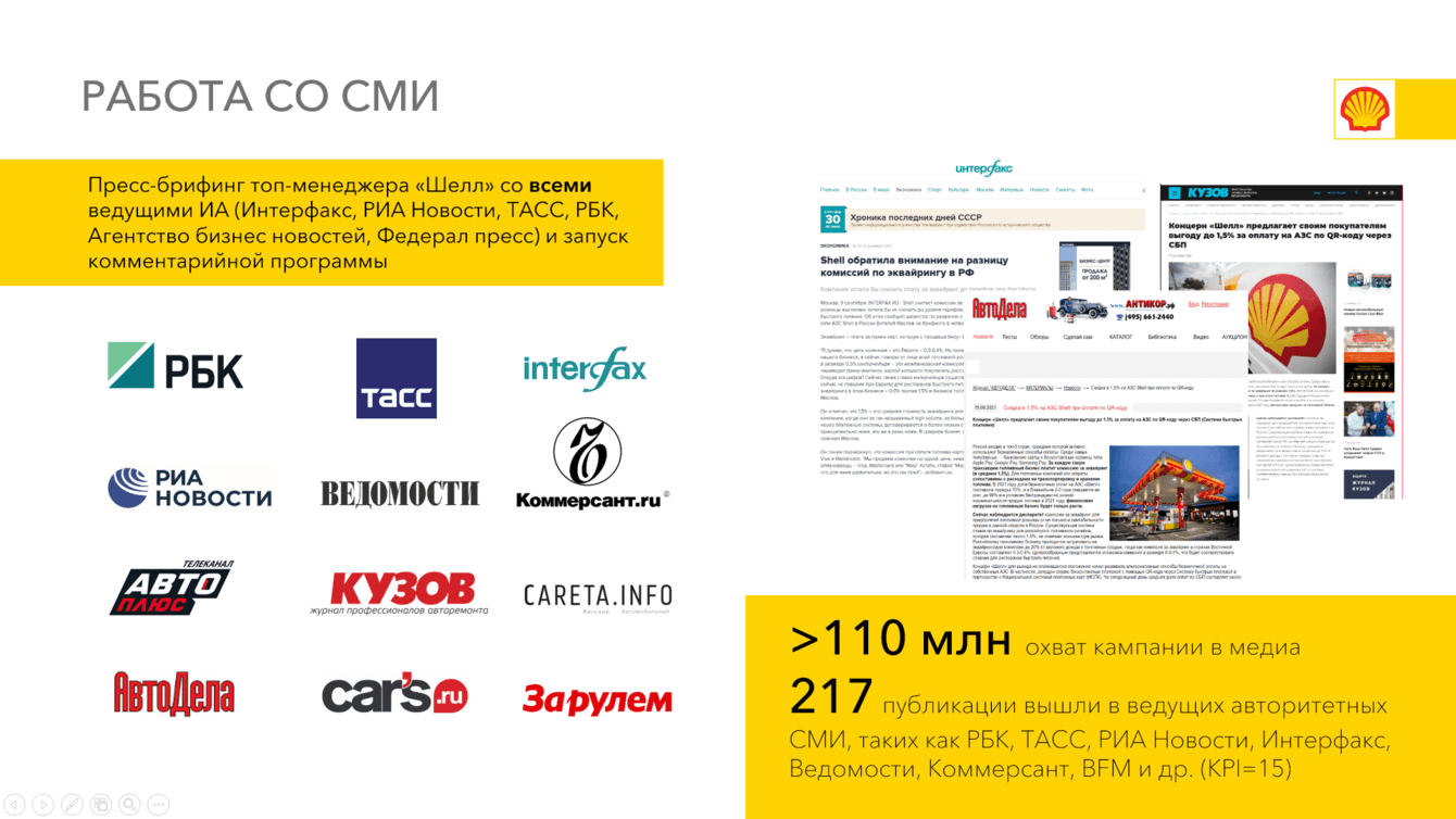 • Пресс-брифинг со ведущими федеральными информационными агентствами, среди которых Интерфакс, РИА Новости, ТАСС, РБК, Агентство бизнес-новостей, Федерал пресс, с топ-менеджером «Шелл» Виталием Масловым. Мероприятие организовали за 2 дня. Тема — неблагоприятная ситуация на топливном рынке в связи с высокими ставками эквайринга, обсуждение почему их следует пересмотреть и какие есть возможные пути решения. Вышедшие по итогам материалы запустили волну обсуждения с участием крупных игроков рынка. А также способствовало тому, чтобы обратить внимание государства на проблему.