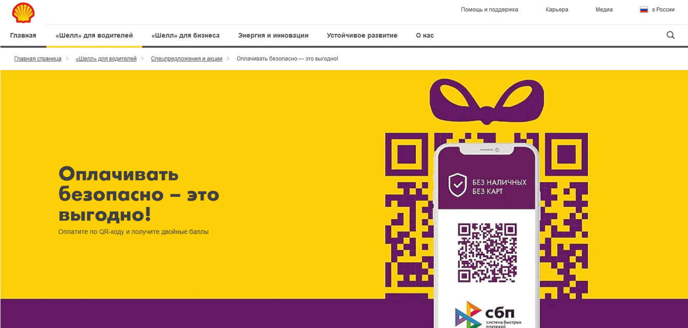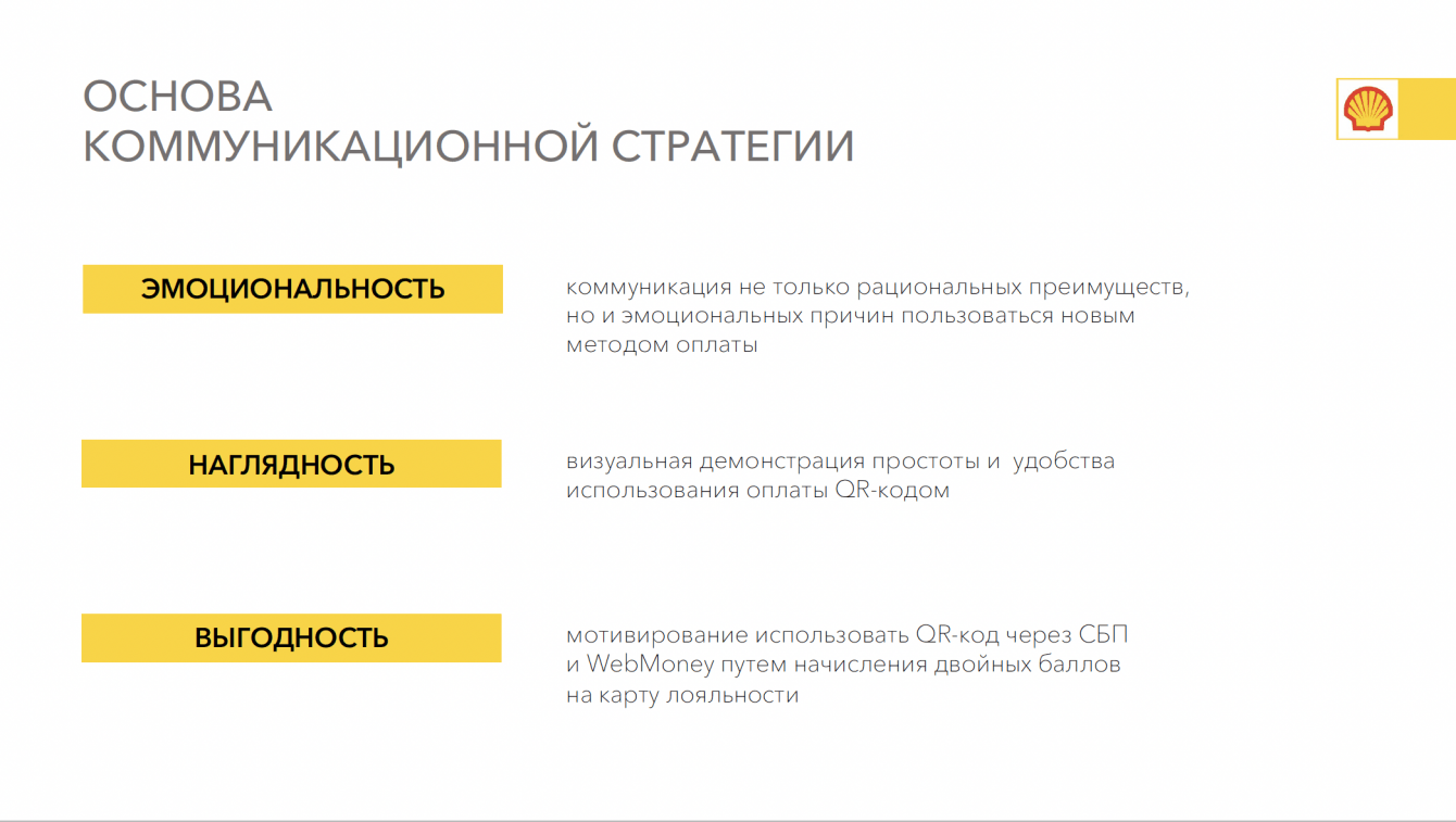 Тем не менее, 28 декабря 2020 года «Шелл», после предварительного тестирования, первый среди конкурентов запустил на всей сети собственных АЗС оплату по QR-коду через Систему быстрых платежей (СБП) и WebMoney. На момент начала кампании в информационном поле тема QR-оплаты обсуждалась не часто (с сентября 2020 всего 1300 публикаций), преимущественно в контексте скептического отношения экспертов и игроков из разных секторов к этому методу оплаты или нейтрально.