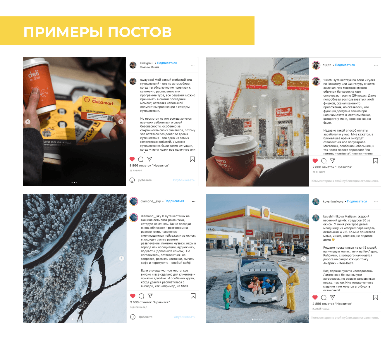 - Лайфхакер «Не нужно брать наличные. Рассказываем, как платить за топливо на Shell (это удобнее и выгоднее!)» (охват 28 млн пользователей, 50 млн просмотров за месяц, 4 минуты — среднее время на странице) + статья опубликована в соцсетях издания (>3 млн подписчиков);