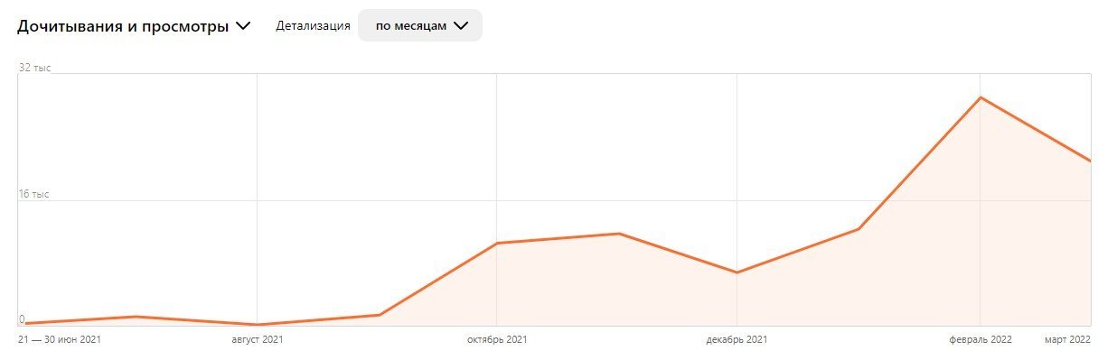 Для привлечения дополнительного трафика дублировали материал блога на канал в Дзене. К февралю 2022 года он набрал ~ 20 000 дочитываний в месяц на тех самых статьях, которыми, как вы помните, был столь недоволен заказчик. Видя хорошие показатели по каналу в Дзен, партнер по бизнесу, занимающийся на тот момент SMM продвижением, продолжил его ведение, забрав эту зону работ на себя. Здесь балл можно отдать партнеру, но он в подсчете не участвует.