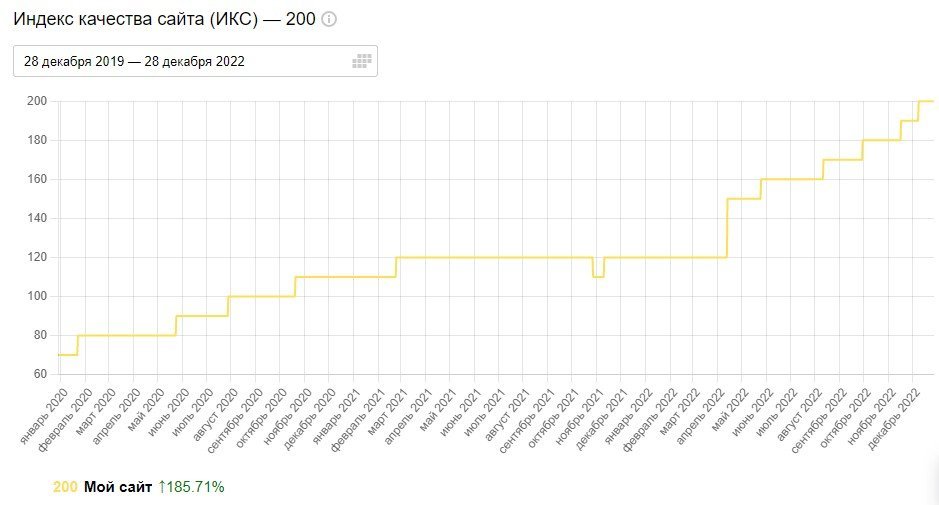Вырос показатель качества сайта – ИКС с 70 до 200. На графике видна просадка, в период внедрения алгоритма YATI.