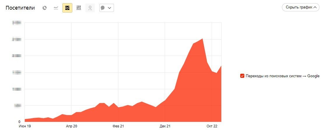 Трафик из Google на пике, в августе 2022 года составил 2544 пользователей. В сентябре потеряли часть трафика, из-за переезда на новый дизайн и зеркало.