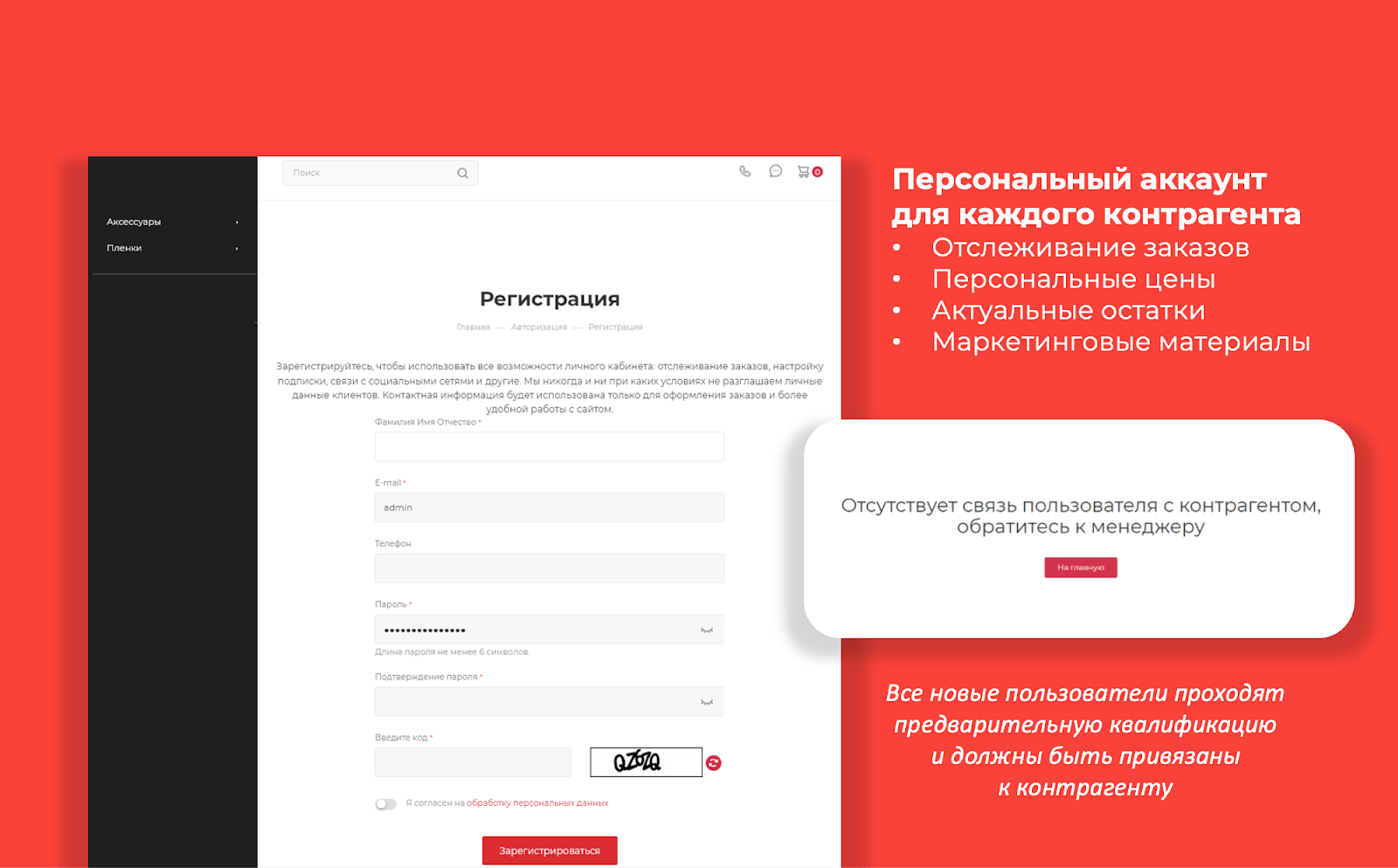 Новые пользователи проходят стандартную процедуру регистрации. Лаконичный интерфейс включает поля для ввода имени, телефона, email, пароля и других данных. Как только пользователь их заполняет, на почту приходит письмо с подтверждением удачной регистрации и инструкцией, что делать дальше. После этого пользователь «привязывает» к своему профилю контрагентов, от лица которых он работает, а производитель назначает ему персонального менеджера.