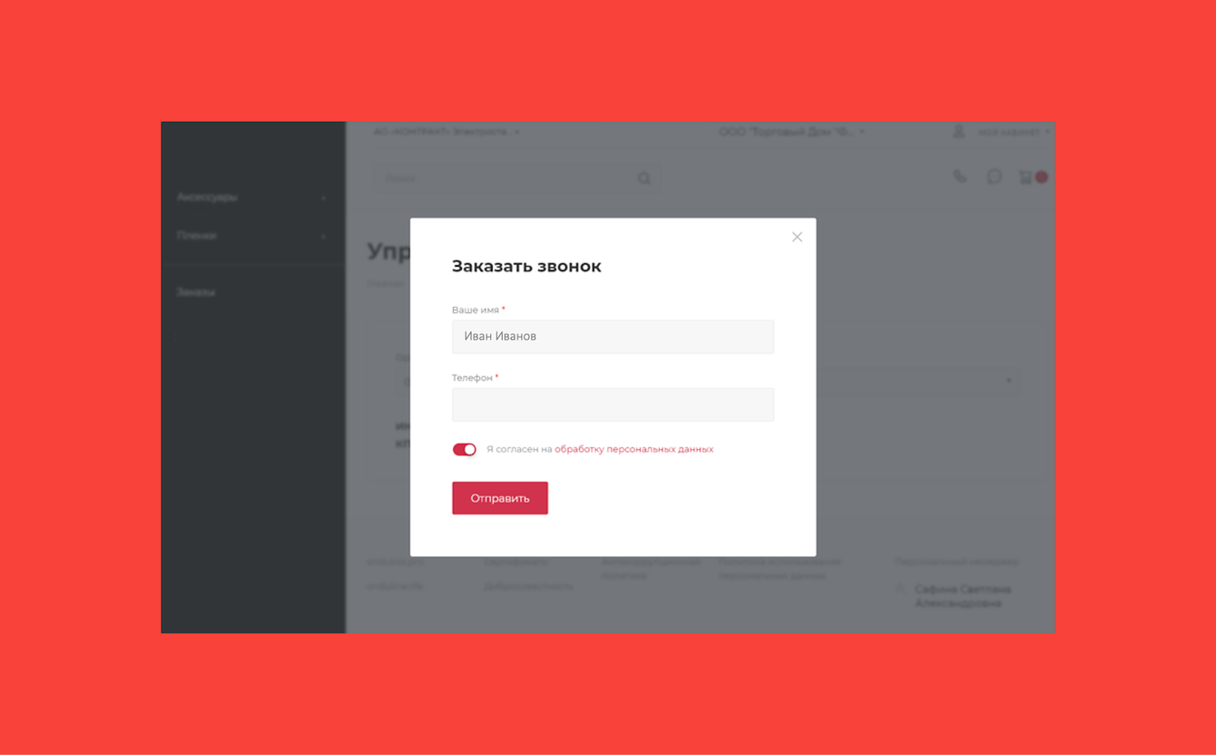 С помощью b2b-портала производитель может работать с обратной связью. На онлайн-площадке есть веб-форма для писем и заказа звонка менеджеру оптовой компании – в последнем случае часть данных о пользователе «подтянется» автоматически из профиля.