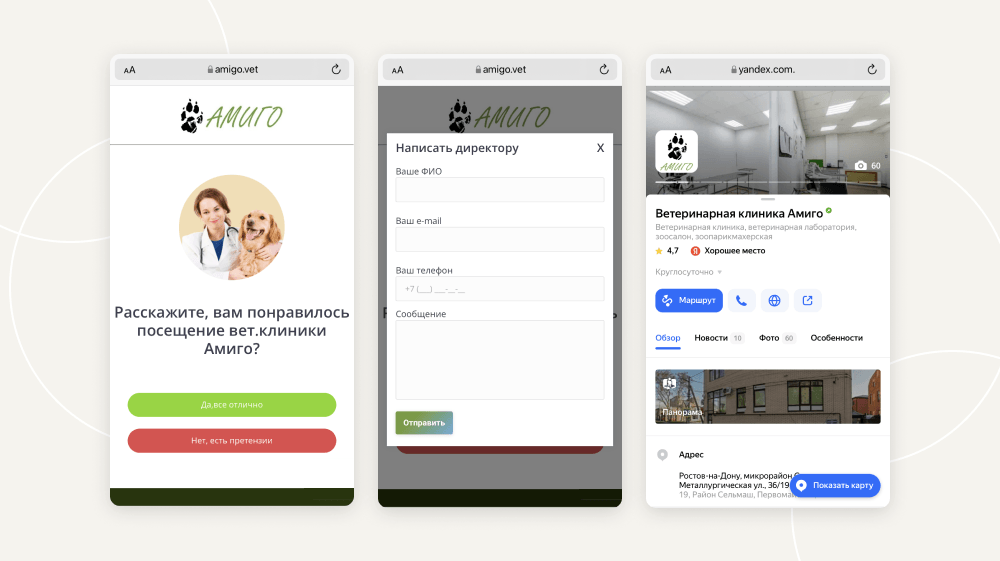 У клиники был неплохой рейтинг, но были и свежие негативные отзывы, на которые не успевали отвечать. Мы разработали механизм, который одновременно мотивирует лояльных клиентов оставлять положительные отзывы и помогает отрабатывать негатив. Это увеличило конверсию посетителей сайта, изучающих информацию перед посещением ветклиники, а также подняло позиции компании в Яндекс Картах.
