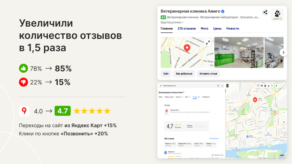 ― Повысить рейтинг в Яндекс Картах, изменив соотношение между позитивными и негативными отзывами. Владельцы животных пользуются такими площадками, чтобы найти клинику в своем районе. И из всех геосервисов именно Яндекс Карты приносили клинике максимум трафика.