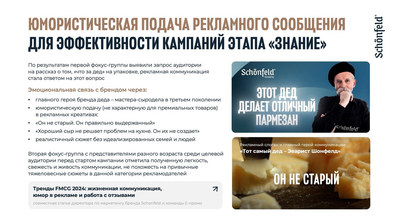 Рекламная кампания была сосредоточена на двух этапах воронки: формирование знания и работе над заинтересованностью, рассмотрением. В рамках максимизации охвата релевантных сегментов и роста заметности в период повышенного спроса задействовалась разработанная имиджевая коммуникация «Что за дед?». Она стала ответом на запросы целевой аудитории по главному герою (выявленные через фокус-группу), изображенному на упаковке сыров (Эварист Шонфелд), а раскрывалась история через видеоформат. После перехода с рекламных материалов у целевой аудитории была дополнительная возможность подробнее познакомиться с Эваристом Шонфелдом на лендинге, содержащим историю и ценности бренда, его главного героя.