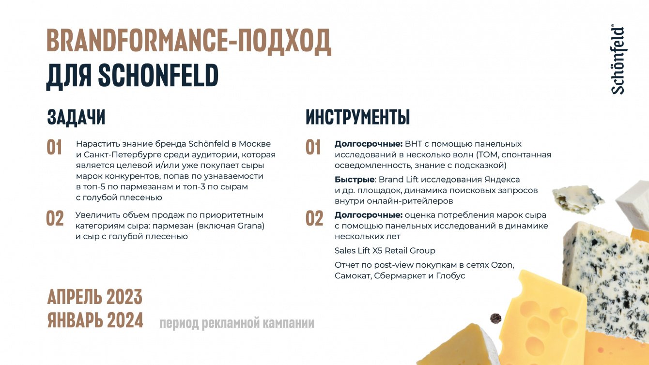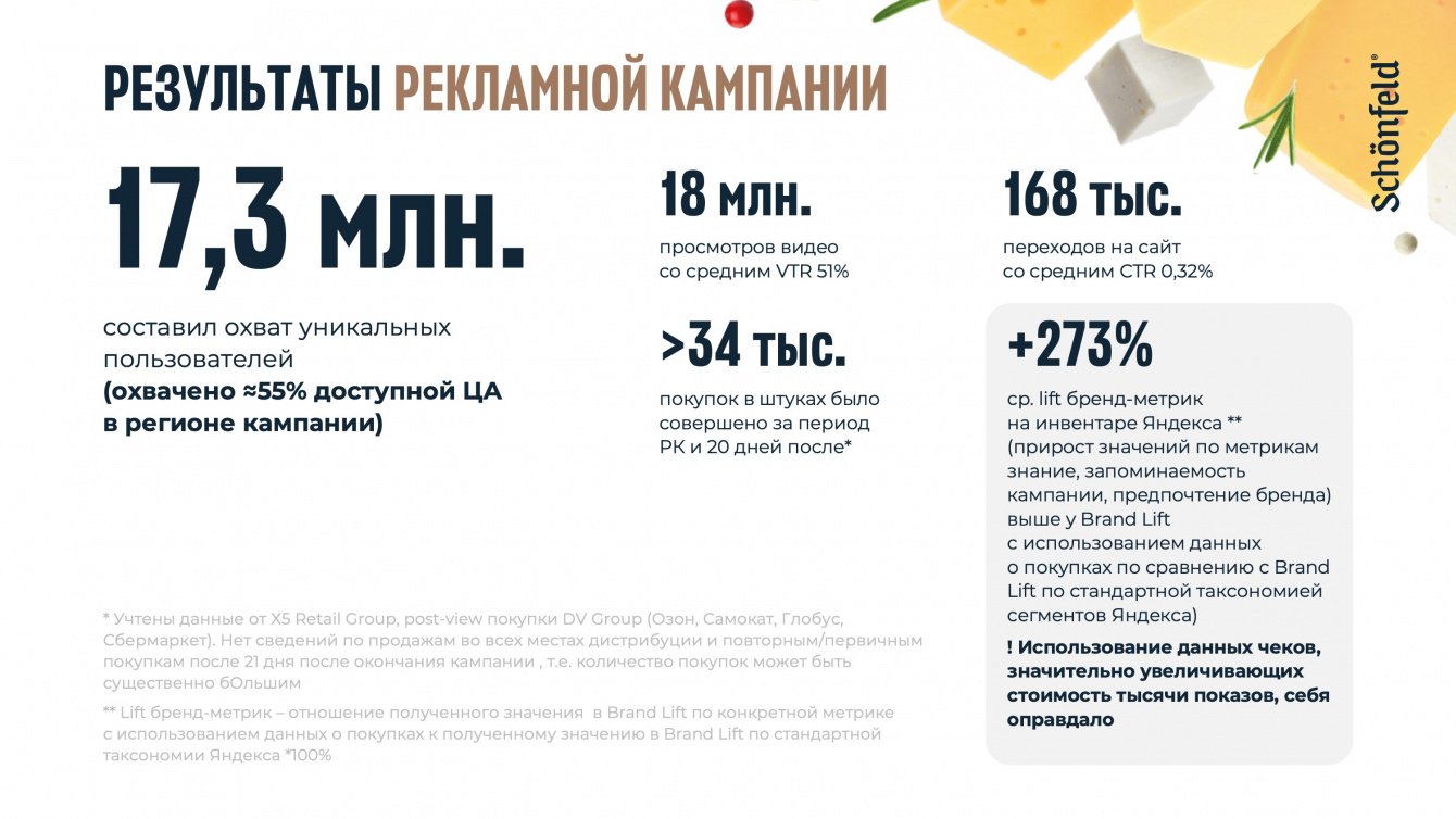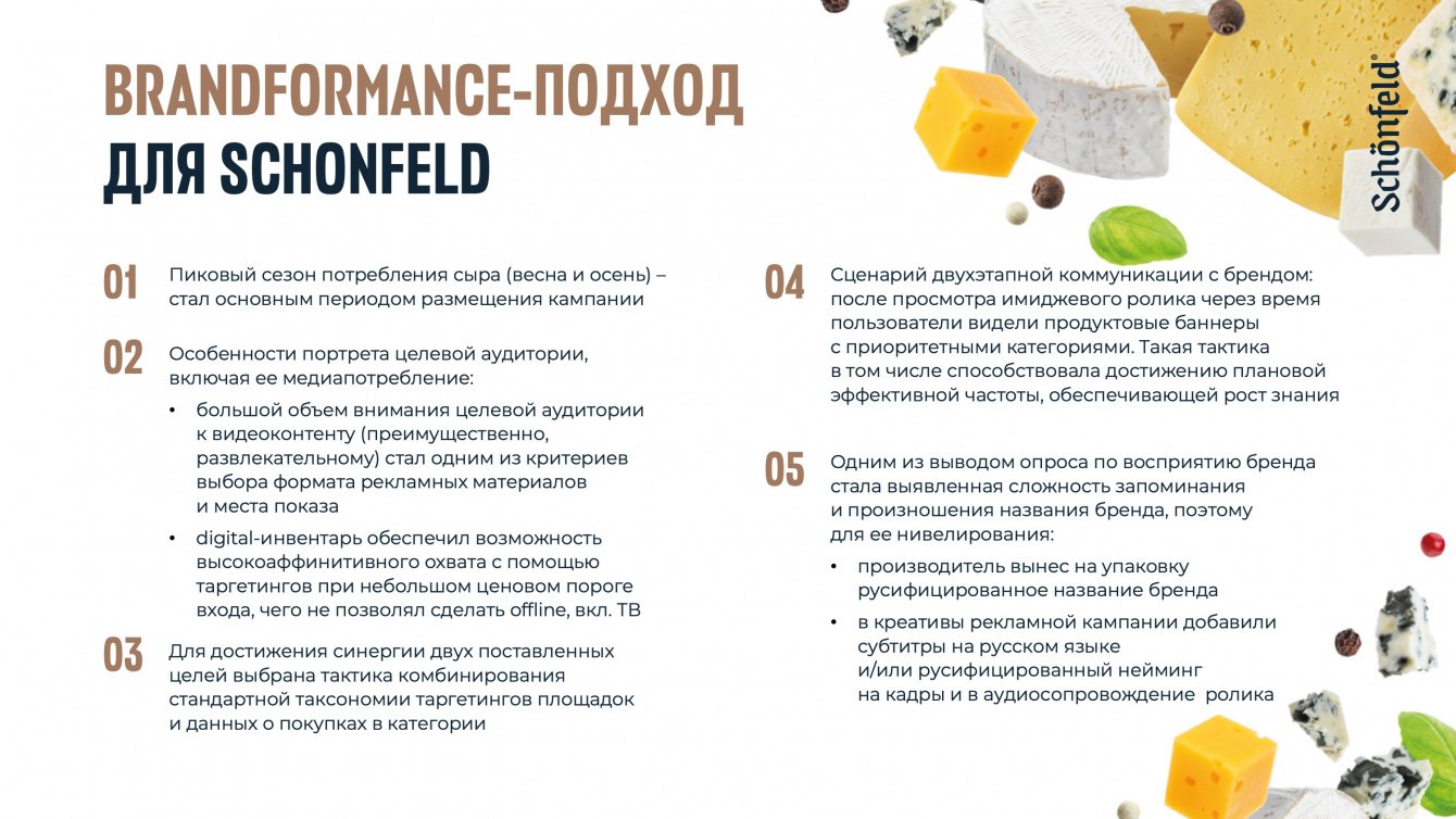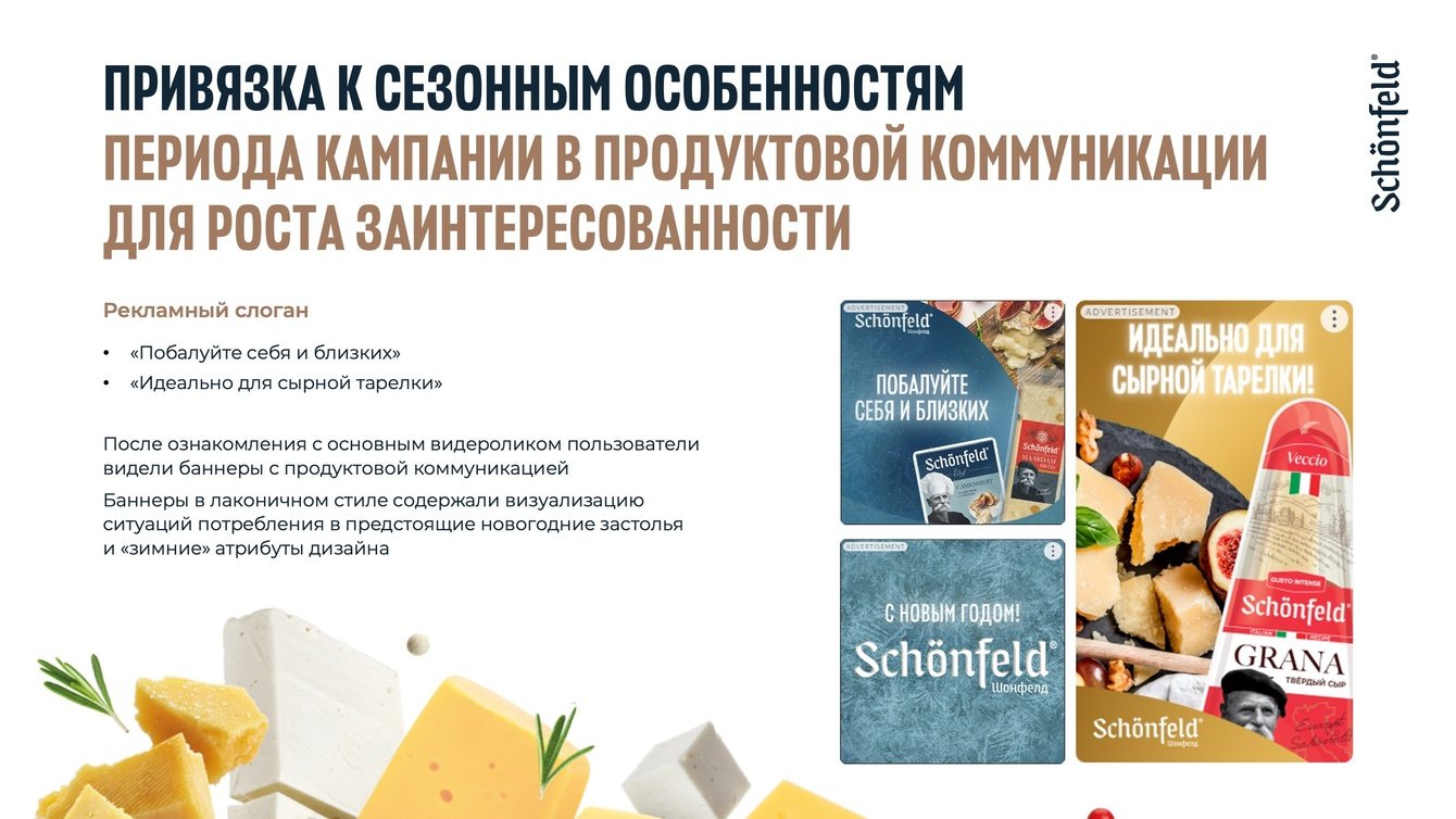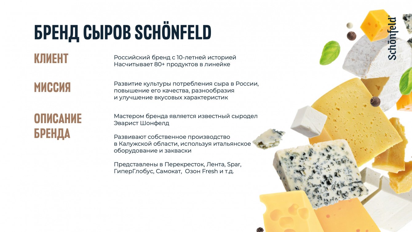 Перед командой стояла задача повысить узнаваемость и увеличить продажи продукции Schonfeld, особенно пармезанов и сыров с голубой плесенью. Проблема заключалась в сложном для восприятия названии бренда и необходимости выхода на более высокие позиции в конкурентном сегменте. Решение включало разработку рекламной кампании с применением таргетинга на основе транзакционных данных. Такой подход обеспечил синергию между ростом узнаваемости бренда и стимулированием покупок, что позволило Schönfeld значительно усилить своё присутствие на рынке Москвы и Санкт-Петербурга.