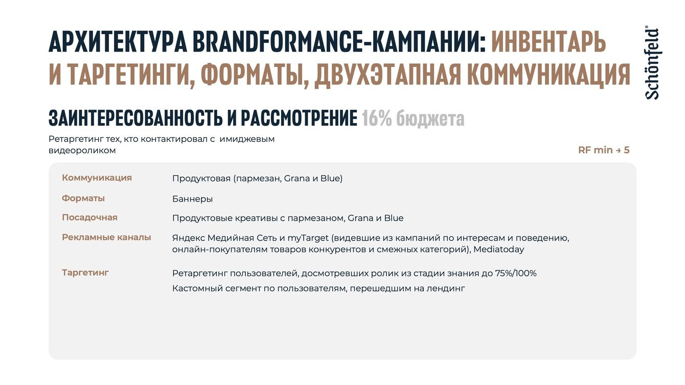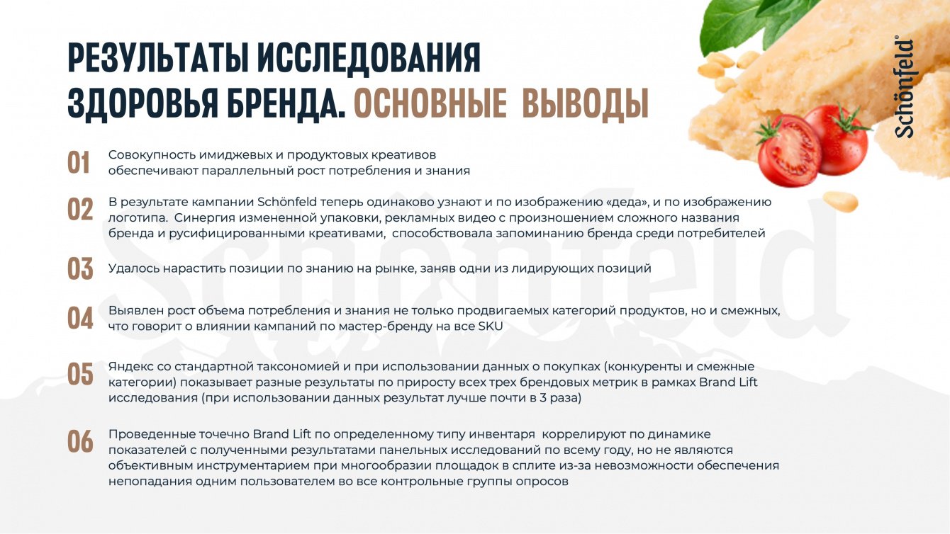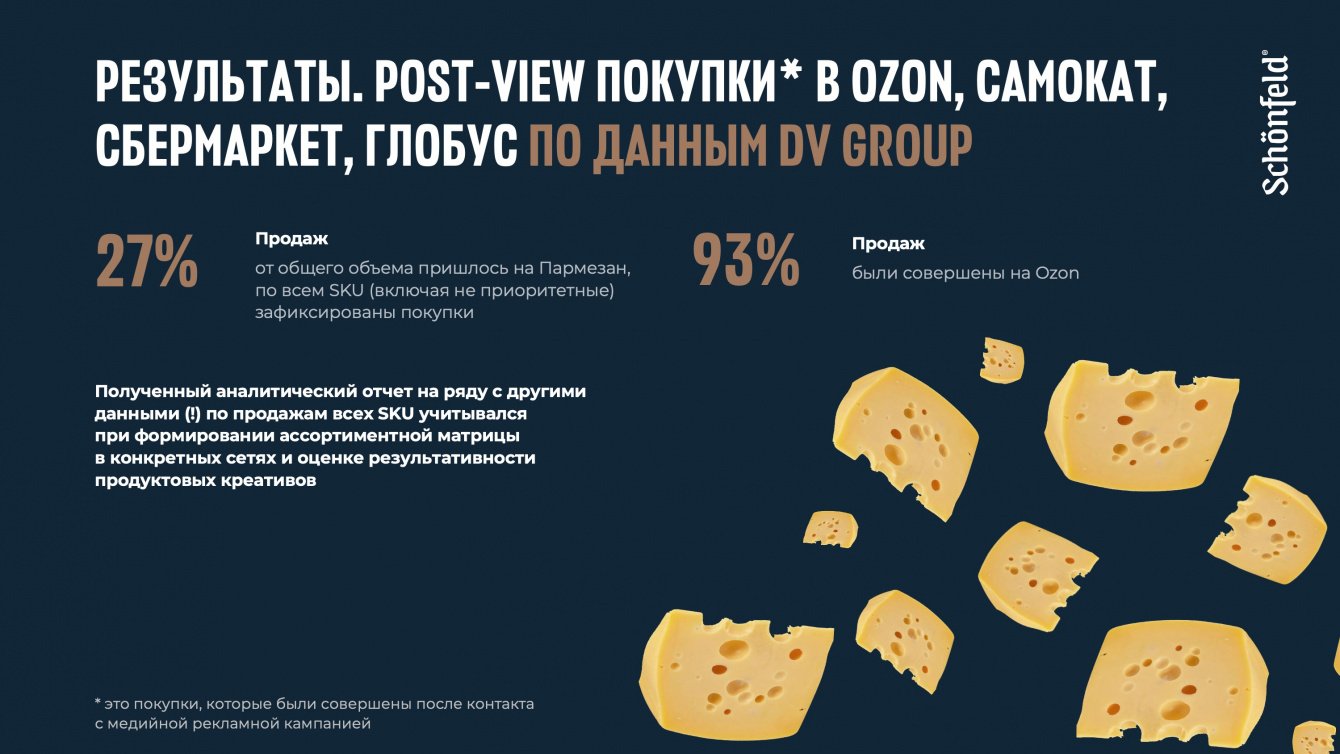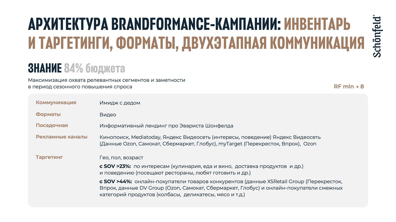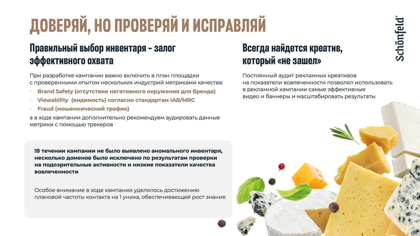 Перед командой стояла задача повысить узнаваемость и увеличить продажи продукции Schonfeld, особенно пармезанов и сыров с голубой плесенью. Проблема заключалась в сложном для восприятия названии бренда и необходимости выхода на более высокие позиции в конкурентном сегменте. Решение включало разработку рекламной кампании с применением таргетинга на основе транзакционных данных. Такой подход обеспечил синергию между ростом узнаваемости бренда и стимулированием покупок, что позволило Schönfeld значительно усилить своё присутствие на рынке Москвы и Санкт-Петербурга.