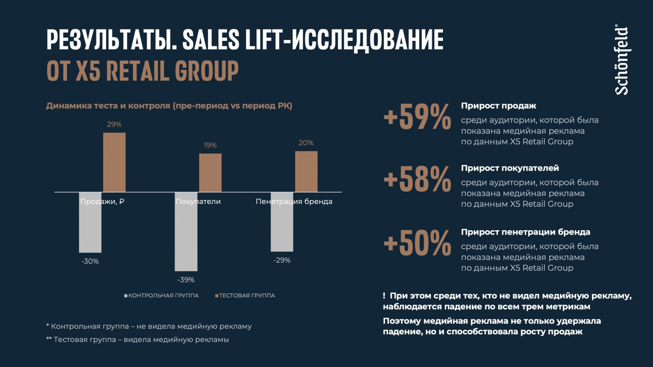 В X5 Retail Group исследование Sales Lift проводилось с использованием контрольной группы (не видевшей рекламу) и тестовой группы (видевшей рекламу). Обе группы подбирались на основе схожих характеристик покупателей конкурентов и смежных категорий продуктов. Данные для тестовой группы собирались через панель поставщика данных, настроенную в рекламном кабинете. Результаты продемонстрировали существенное улучшение продаж среди целевой аудитории, охваченной рекламой на базе данных X5 Retail Group, а также укрепление позиций бренда на рынке.