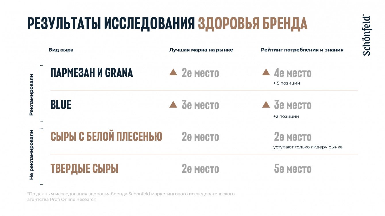 В категории пармезанов Schonfeld занял 2 место в рейтинге «Лучших марок на рынке» и 4 место в «Рейтинге потребления и знания марок» (+5 позиций). В категории сыров с голубой плесенью производитель занял 3 место в рейтинге «Лучшая марка на рынке» и 3 место (+2 позиции) в «Рейтинге потребления марок и знания». Замеры проведены исследовательским агентством Profi Online Research.