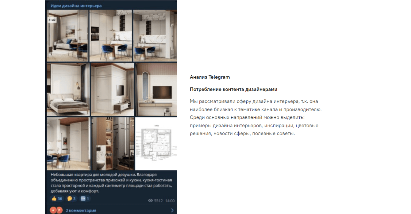 На основе анализа мы сделали выводы о предпочтениях ЦА в потреблении контента. Это включало изучение предпочтений дизайнеров и архитекторов в отношении типов контента, таких как рендеры интерьеров, архитектурные проекты, стили и т.д.