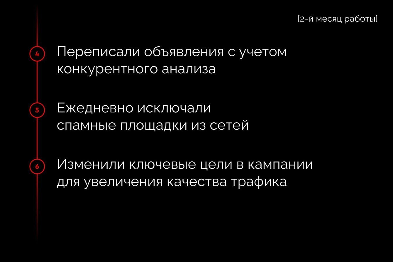 Кроме того, ежедневно проводился мониторинг кампаний с их оптимизацией: исключали нецелевые площадки в РСЯ для повышения качества трафика; расширяли семантику в поисковых кампаниях; отключали неэффективные ключевые фразы; минусовали нецелевые поисковые запросы; работали со стратегиями кампаний, добавляли микроцели для их скорейшего обучения.
