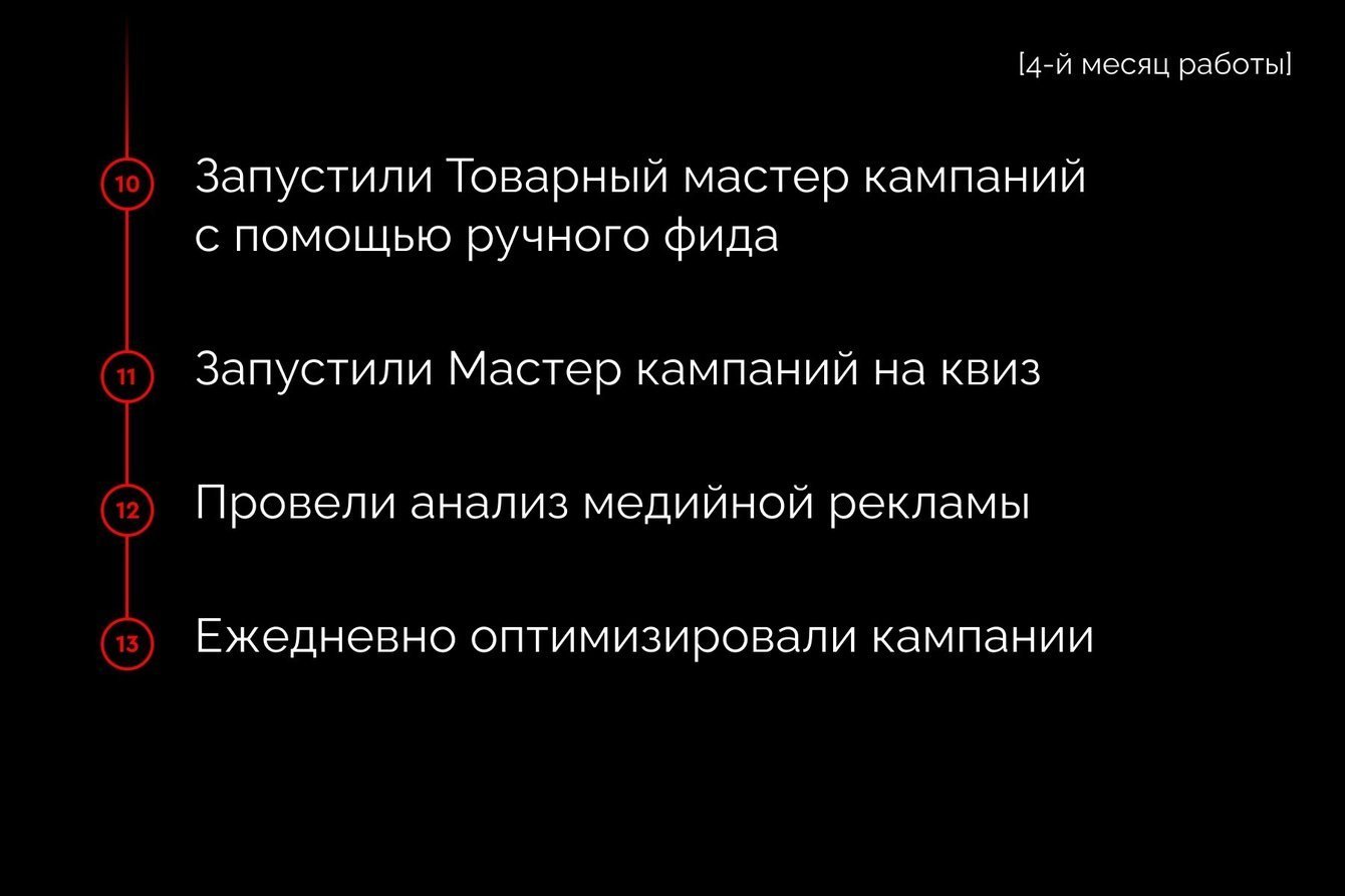 Также запустили сетевые кампании на квиз. Чтобы кампании работали стабильно, а системам хватало данных для обучения, использовалась не только цель на отправку формы квиза, но и прохождение четырех шагов квиза.
