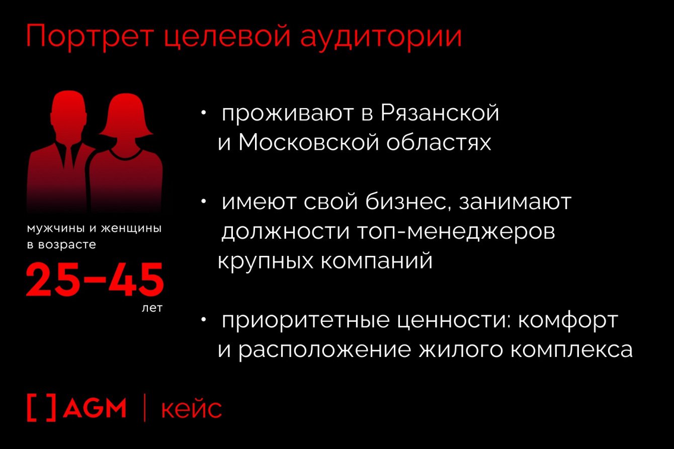 Целевая аудитория проекта— обеспеченные мужчины и женщины в возрасте 25-45 лет, проживающие в Рязанской и Московской областях. Часто имеют свой бизнес, либо занимают должности топ-менеджеров крупных компаний. Приоритетные ценности для них комфорт и расположение жилого комплекса.