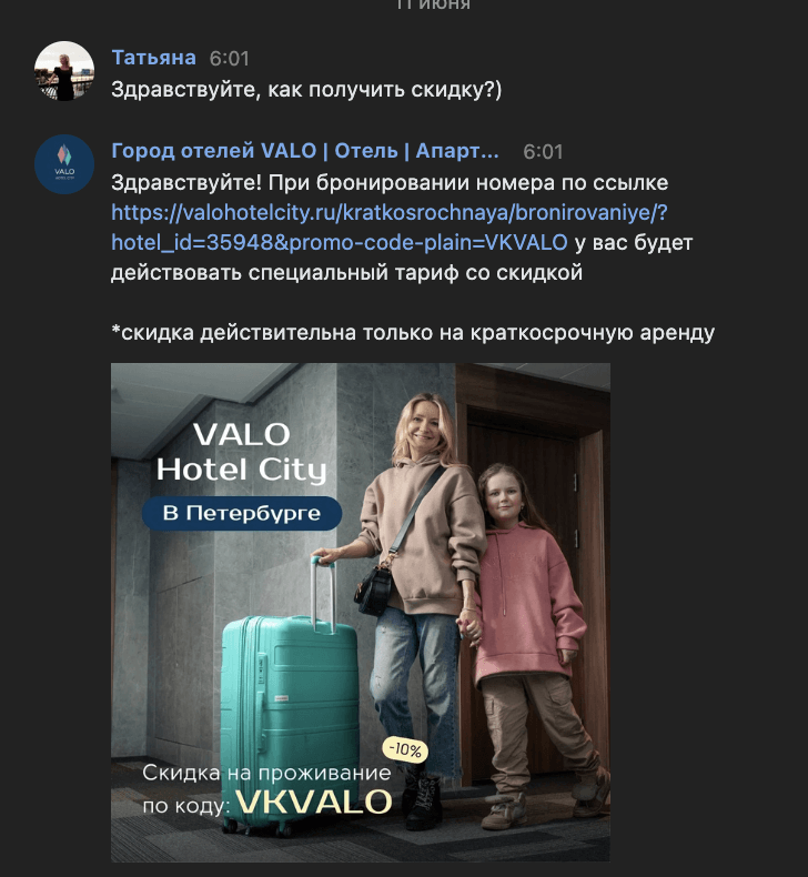 У нашего клиента апарт-комплекса VALO активные сообщества в соц. сетях. Мы много работаем с уникальным контентом и поощряем подписчиков даря промокод на скидку при бронировании. Помимо того, что это приятный бонус, это помогает нам отслеживать результативность нашей работы.