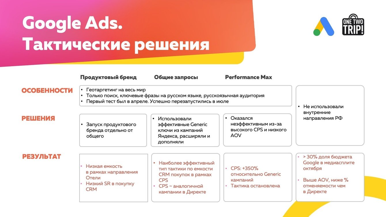 3. В Google Ads получили более низкий процент отмены бронирований и более высокий средний чек заказов по сравнению с остальными каналами. С учетом эффективности канала решили увеличить его долю в будущем медиасплите до 30% и более.