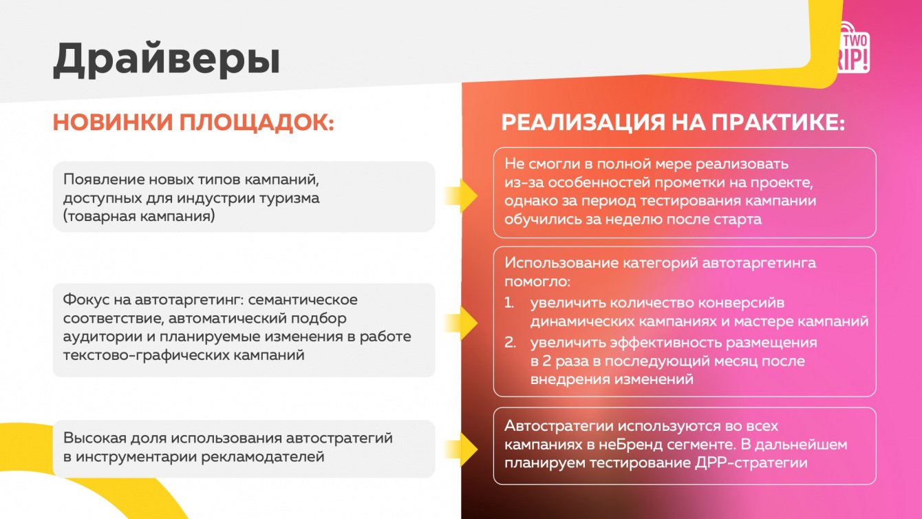 Для первых трех типов кампаний характерна высокая конкуренция в отрасли и значительный рост CPC, поэтому чтобы увеличить число бронирований в кампаниях по запросам, включающим продуктовый бренд, мы: