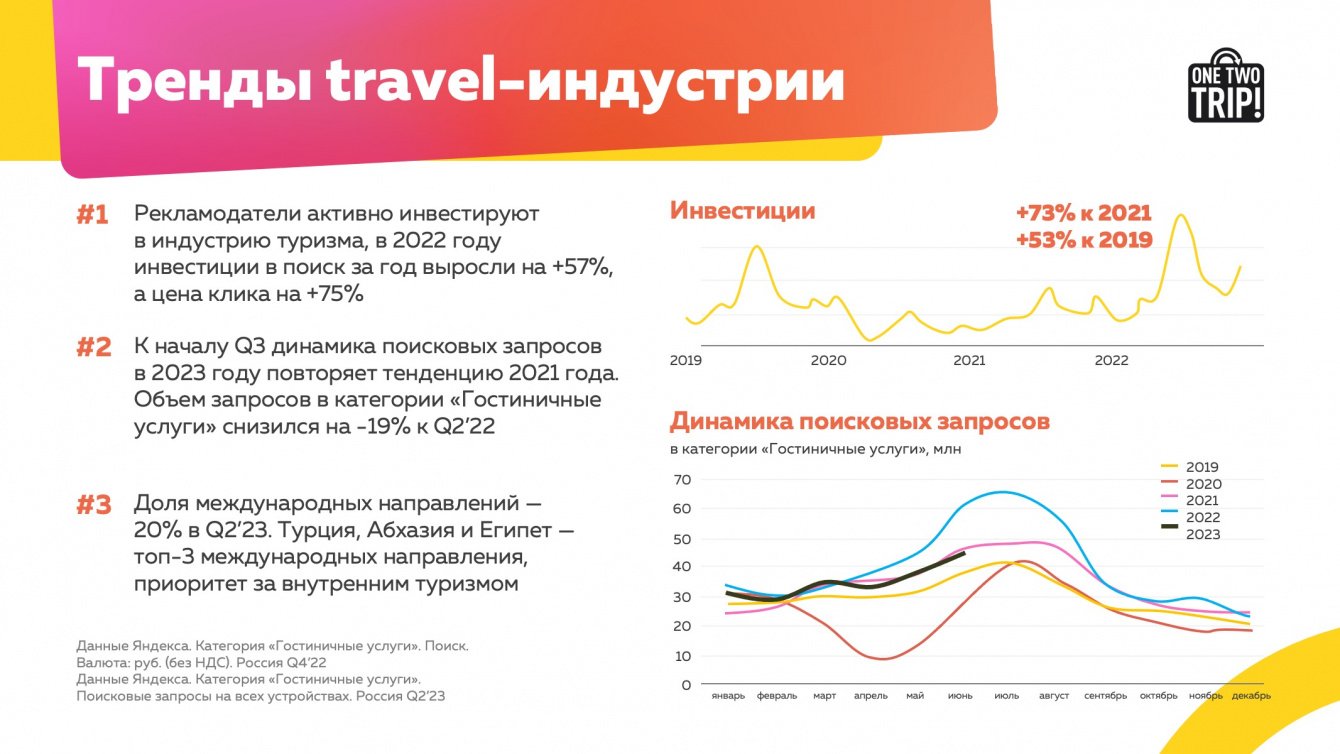 - во 2 квартале 2023 года доля международных направлений составила 20%, в лидерах оказались Турция, Абхазия и Египет в связи с тем, что получить шенгенские визы стало сложнее, а стоимость путешествий выросла.
