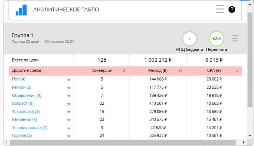 Сократили расход на неэффективные срезы и внесли понижающие корректировки на устройства на -30% по кампаниям: