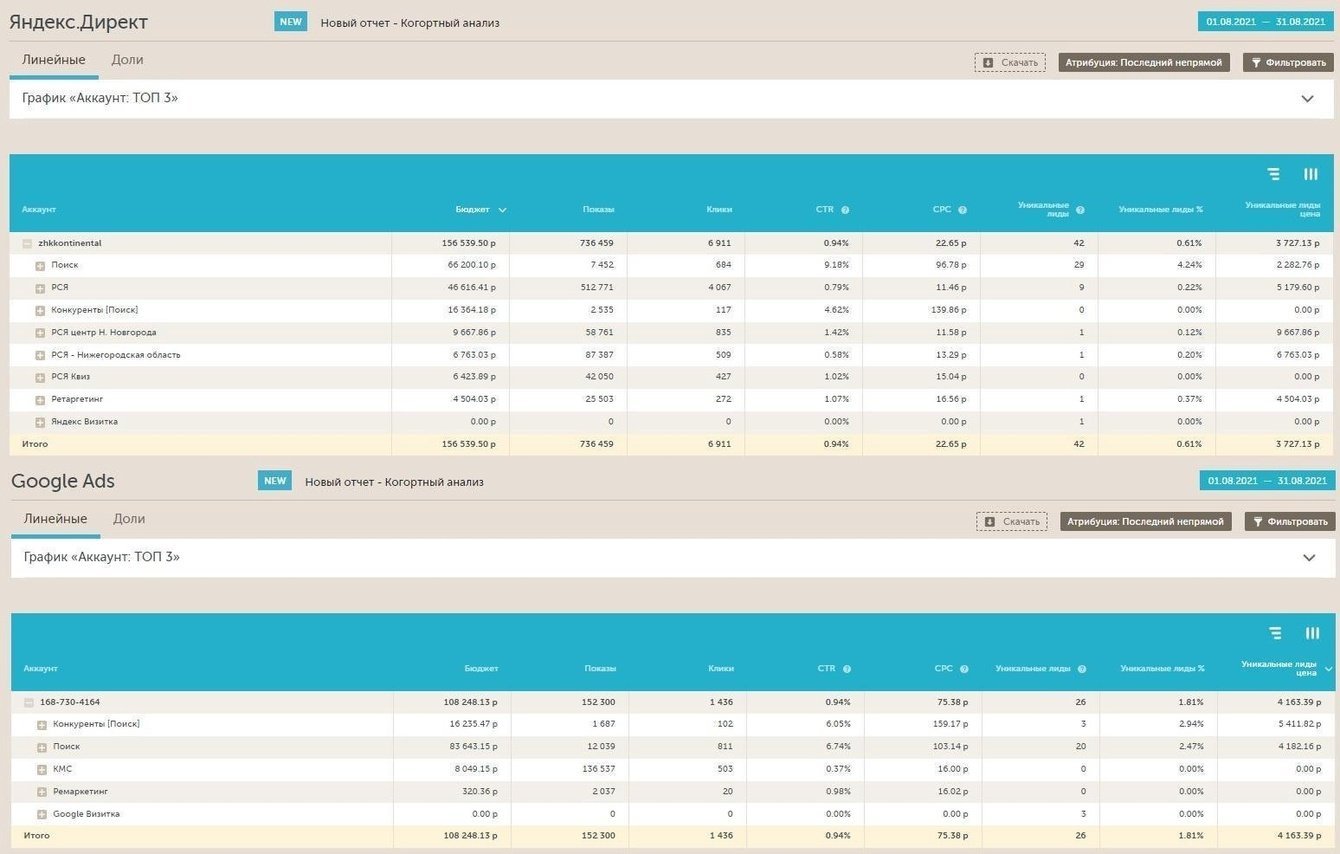Период работы предыдущего подрядчика закончился, и с 21 июля 2021 года рекламную кампанию уже запускал Новатор. Пока лендинг готовился, реклама с новых кабинетов шла на сайт ЖК. Результаты были противоречивые. Цена за уникальный лид в Яндексе выросла в три раза и составила 10 099,31р с НДС. В Google она, напротив, упала более, чем в два раза – до 10 761,66 р с НДС.