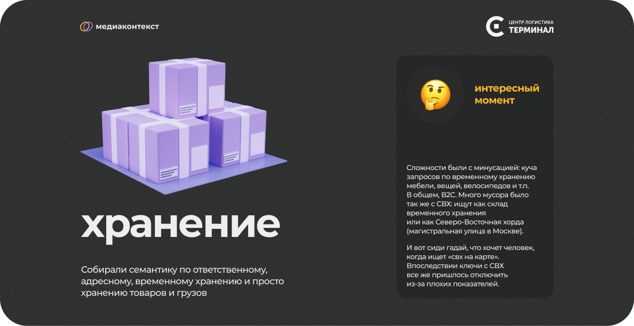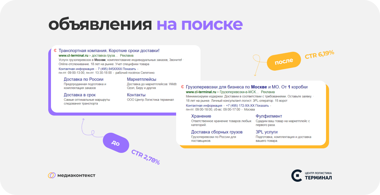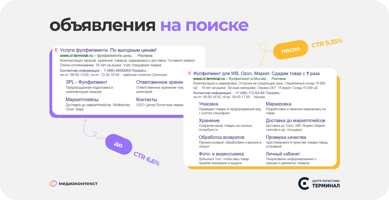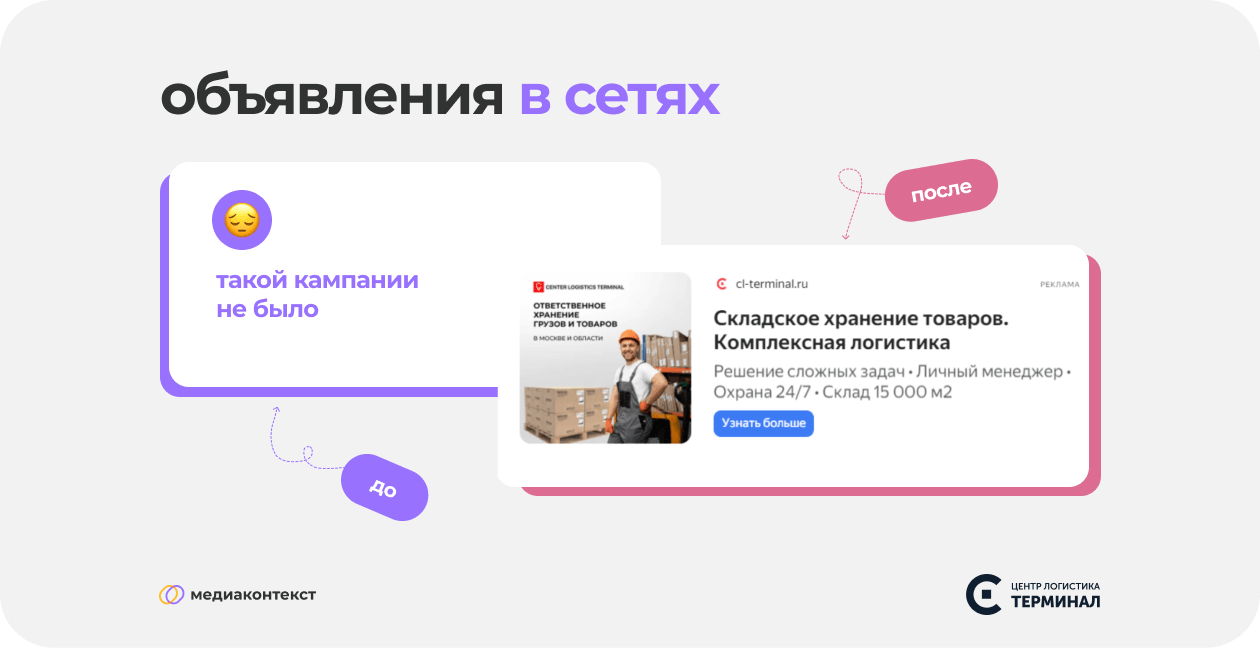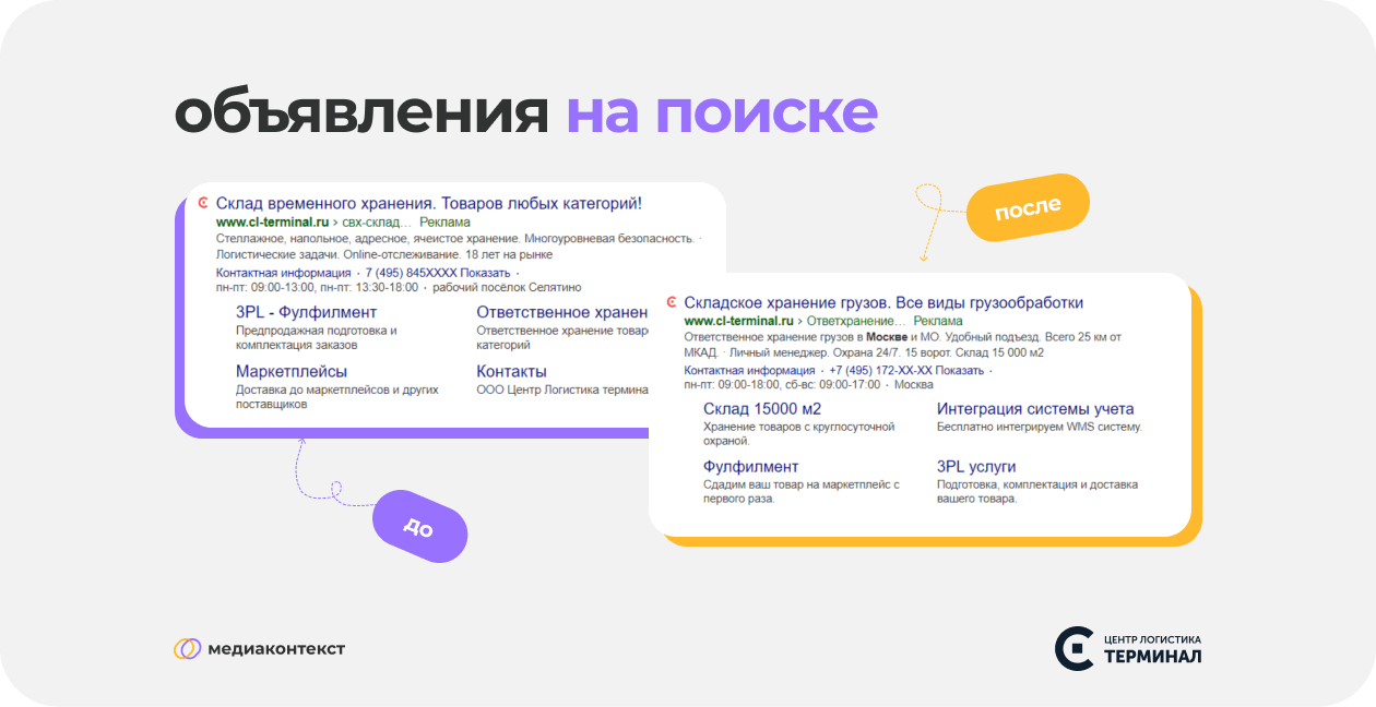 Проанализировали конкурентов и поняли, что важно людям при поиске склада: его размеры, охрана, расположение (расстояние от МКАДа, район), возможность предоставления услуг комплексной логистики. Использовали это в разных элементах объявлений.