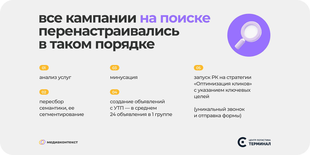 В итоге получилась мешанина из старых и новых кампаний разных направлений. Не переработанные кампании тянули все остальное вниз, сливали, приводили дорогие лиды, но останавливать их было нельзя, а разом все перенастроить было просто невозможно. Оставлять их в таком состоянии было рискованно. Поэтому по-быстрому отключили совсем сливающие ключи, а кампании на поиске перевели на оптимизацию кликов с ручного управления ставками. И, конечно же, добавили цели (уникальный звонок и отправка формы) для оптимизации кампаний. Хоть это и очень условный ремонт, но он должен был немного тормознуть дальнейший слив.