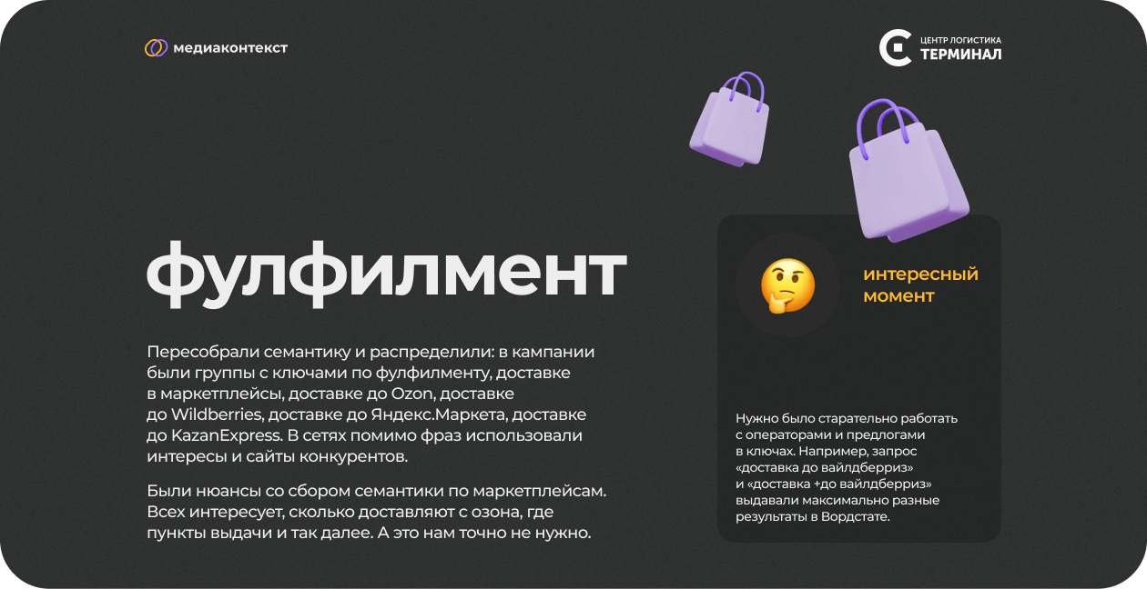 Перед созданием креативов снова посмотрели на конкурентов. Что было важно для клиентов: охрана, полный цикл фулфилмента, расположение склада, также чем больше маркетплейсов, с которыми сотрудничает компания — тем лучше.