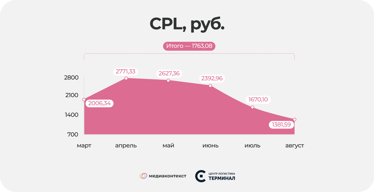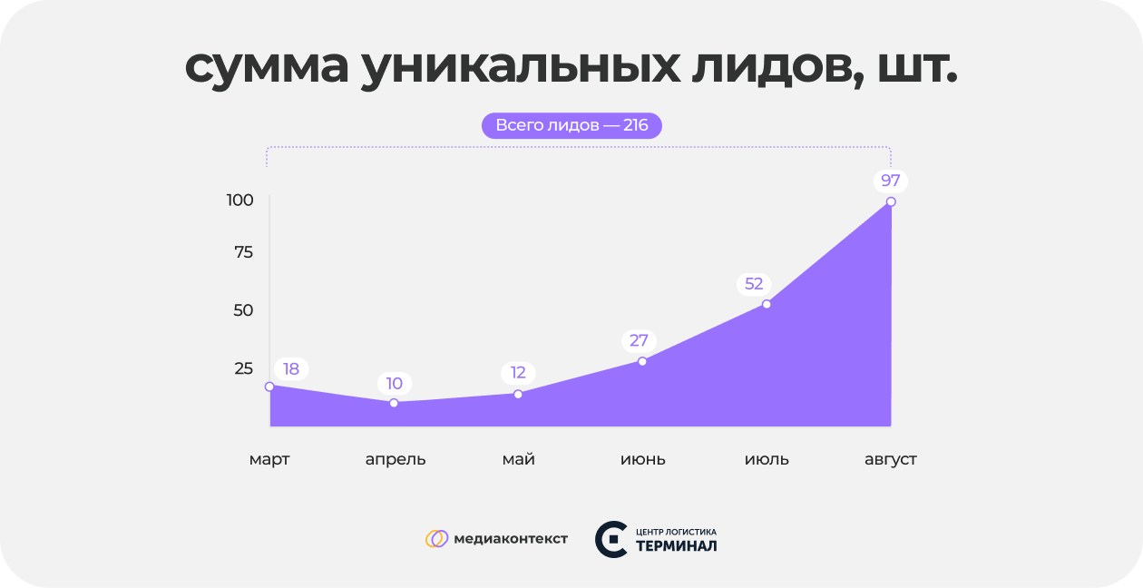 Поставленные цели по количеству и стоимости лидов выполнили с превышением. Первые результаты получили уже в первый месяц работы, а результаты за 3 месяца работы можно увидеть ниже. Стоимость лида постепенно снижалась при том, что количество лидов росло.