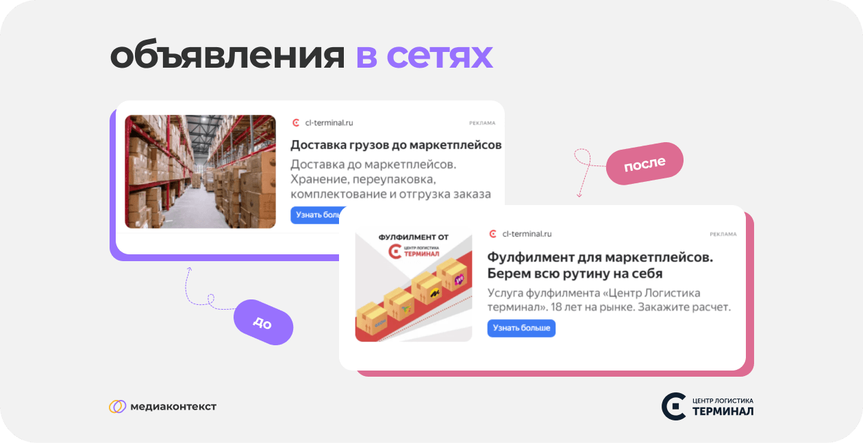 Проанализировали конкурентов и поняли, что важно людям при поиске склада: его размеры, охрана, расположение (расстояние от МКАДа, район), возможность предоставления услуг комплексной логистики. Использовали это в разных элементах объявлений.