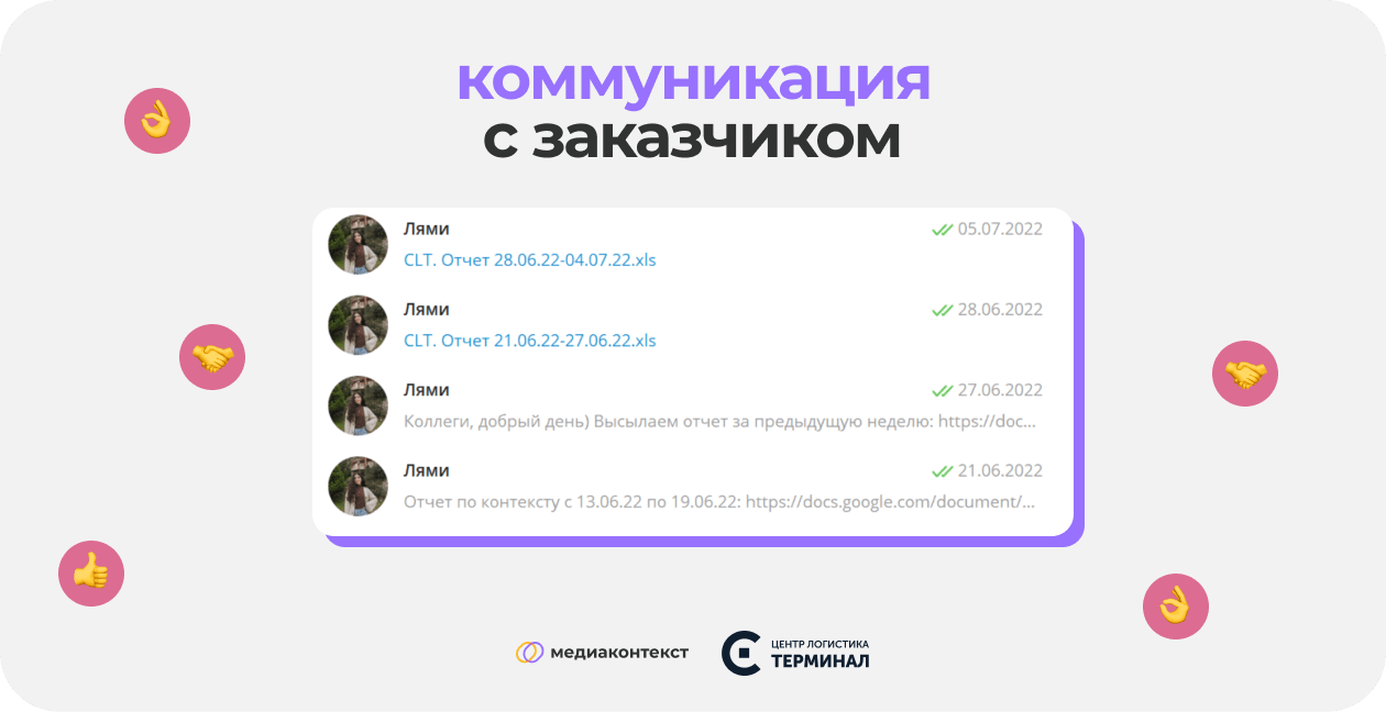 Ну и, конечно же, помимо этих результатов - мы настроили коммуникацию с заказчиком. Чат с еженедельными и ежемесячными отчетами, созвоны, быстрое реагирование на просьбы клиента - залог счастья подрядчика и заказчика.