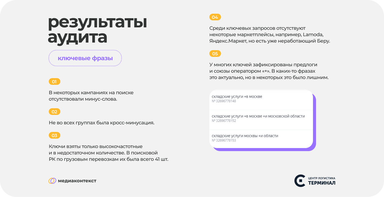 Перед созданием креативов снова посмотрели на конкурентов. Что было важно для клиентов: охрана, полный цикл фулфилмента, расположение склада, также чем больше маркетплейсов, с которыми сотрудничает компания — тем лучше.