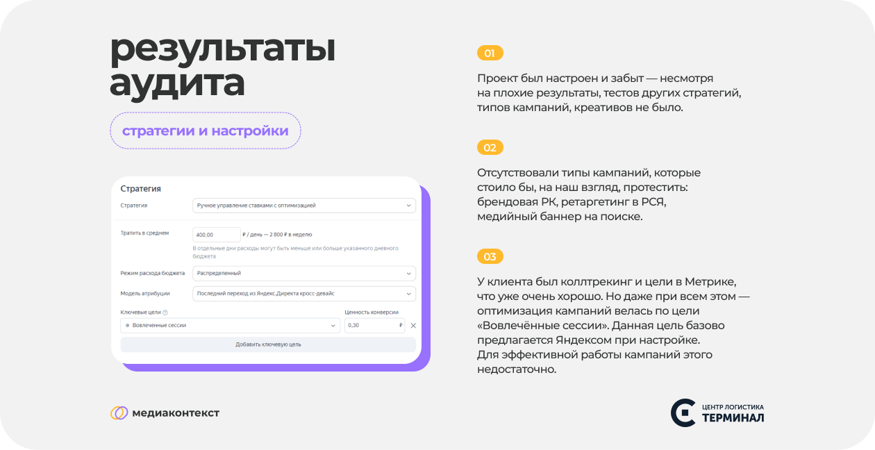 В итоге получилась мешанина из старых и новых кампаний разных направлений. Не переработанные кампании тянули все остальное вниз, сливали, приводили дорогие лиды, но останавливать их было нельзя, а разом все перенастроить было просто невозможно. Оставлять их в таком состоянии было рискованно. Поэтому по-быстрому отключили совсем сливающие ключи, а кампании на поиске перевели на оптимизацию кликов с ручного управления ставками. И, конечно же, добавили цели (уникальный звонок и отправка формы) для оптимизации кампаний. Хоть это и очень условный ремонт, но он должен был немного тормознуть дальнейший слив.