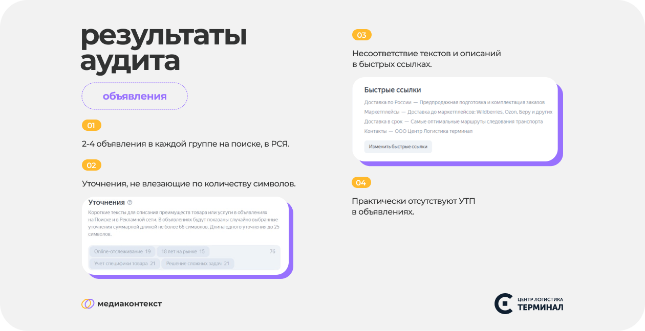 Посмотрев объявления конкурентов, вычленили основные УТП: скорость, соблюдение сроков, личный менеджер, минимальное количество паллет/коробок.