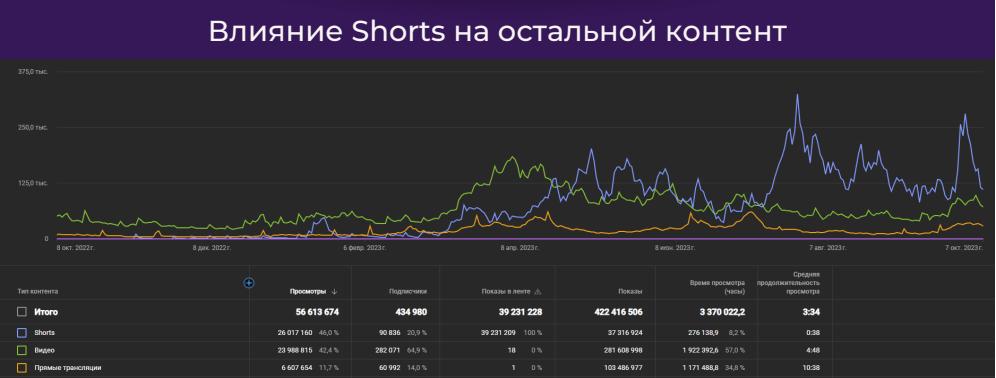Решению этой задачи поспособствовало внедрение Shorts. Короткие видео положительно повлияли на все показатели канала.