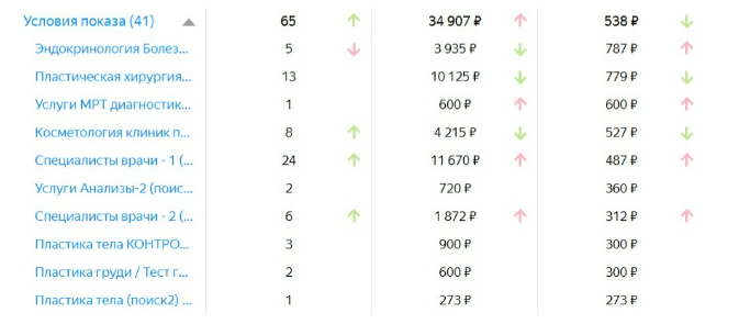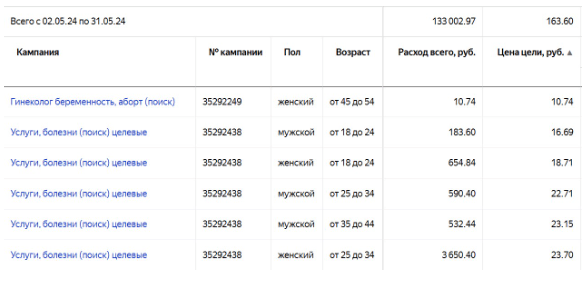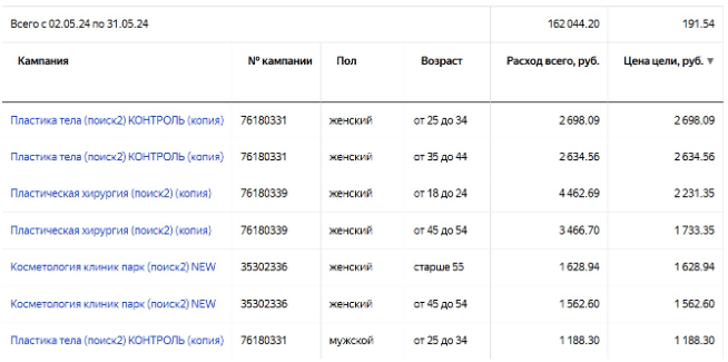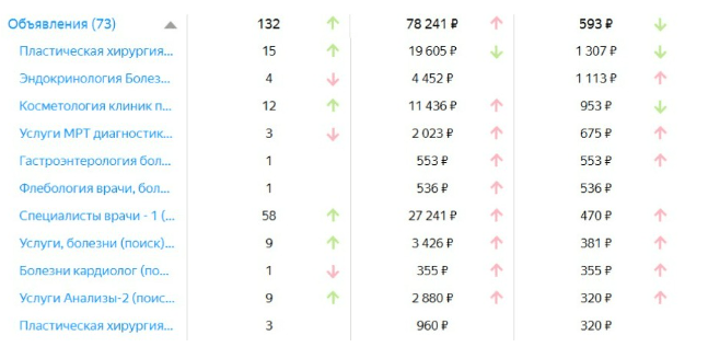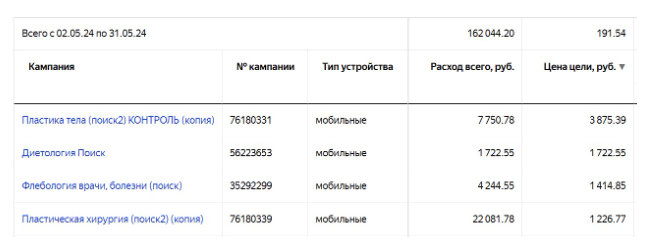 Из отчета видно, что по некоторым объявлениям стоимость заявки значительно превышала средний показатель (в 6 раз). Такие объявления мы отключили.