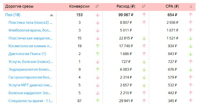 Из отчета видно, что есть аудитории, которые приносят заявки в 20 раз дороже средней стоимости. Такие аудитории решили отключить.