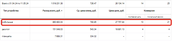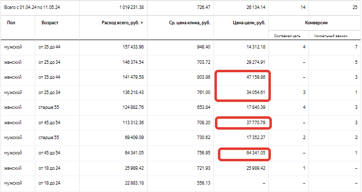 Рассмотрели статистику с 1 апреля по 11 мая по рекламным кампаниям из списка. Увидев, неравномерную стоимость заявки разных групп пользователей мы рекомендовали снизить ставки на условия показа на -50%Увидели, что кампания приносит самые дешевые конверсии.