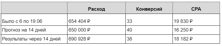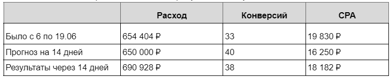 Фактический результат от внесенных изменений чуть хуже прогнозируемого, так как аудит сделан на небольшом количестве целей и спад конверсий вследствие сезонности усиливается.