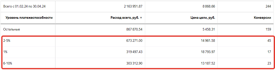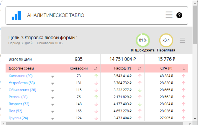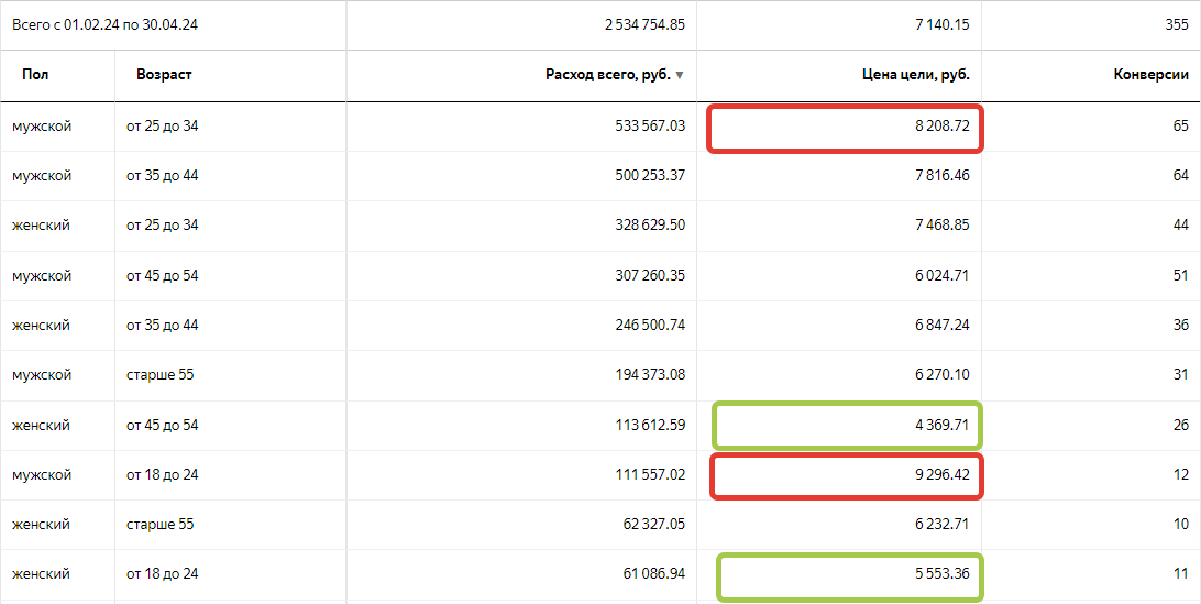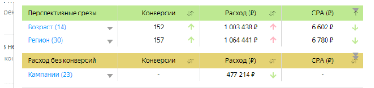 Кампания приносила конверсии дороже среднего. Порекомендовали сократить расходы на неэффективные срезы, сохранив количество конверсий.