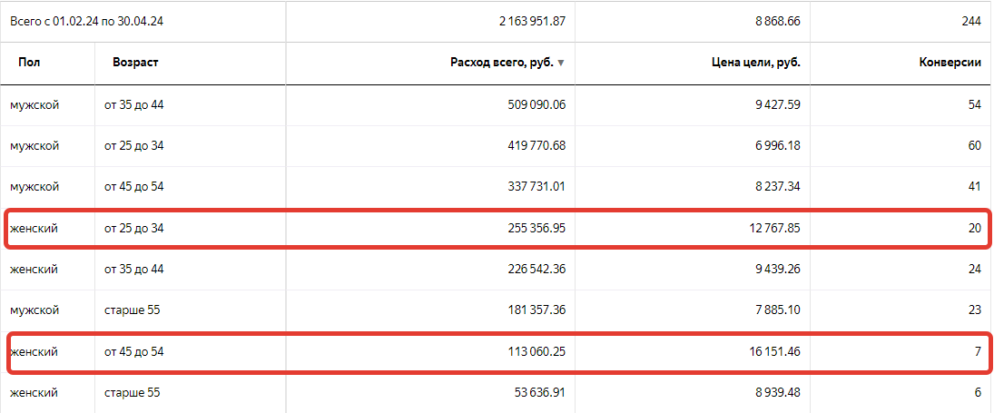 В первую очередь мы провели верхнеуровневый анализ по рекламным кампаниям, так как задача была снизить CPA и понять как можно получить больше конверсий с текущими рекламными кампаниями. Мы пришли к выводу, что необходима балансировка бюджета: снижение затрат на дорогих срезах и увеличение на перспективных. Рекомендации по корректировкам ниже.
