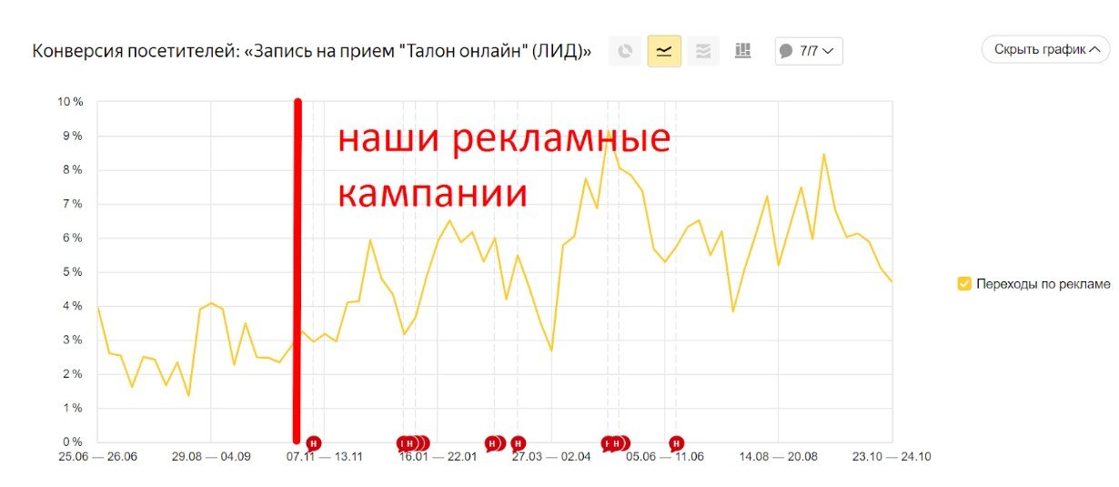 По мере сбора статистики о том, как аудитория взаимодействует с рекламой и с самим сайтом мы калибровали трафик за счет настройки ставок и обучения автостратегий Директа.