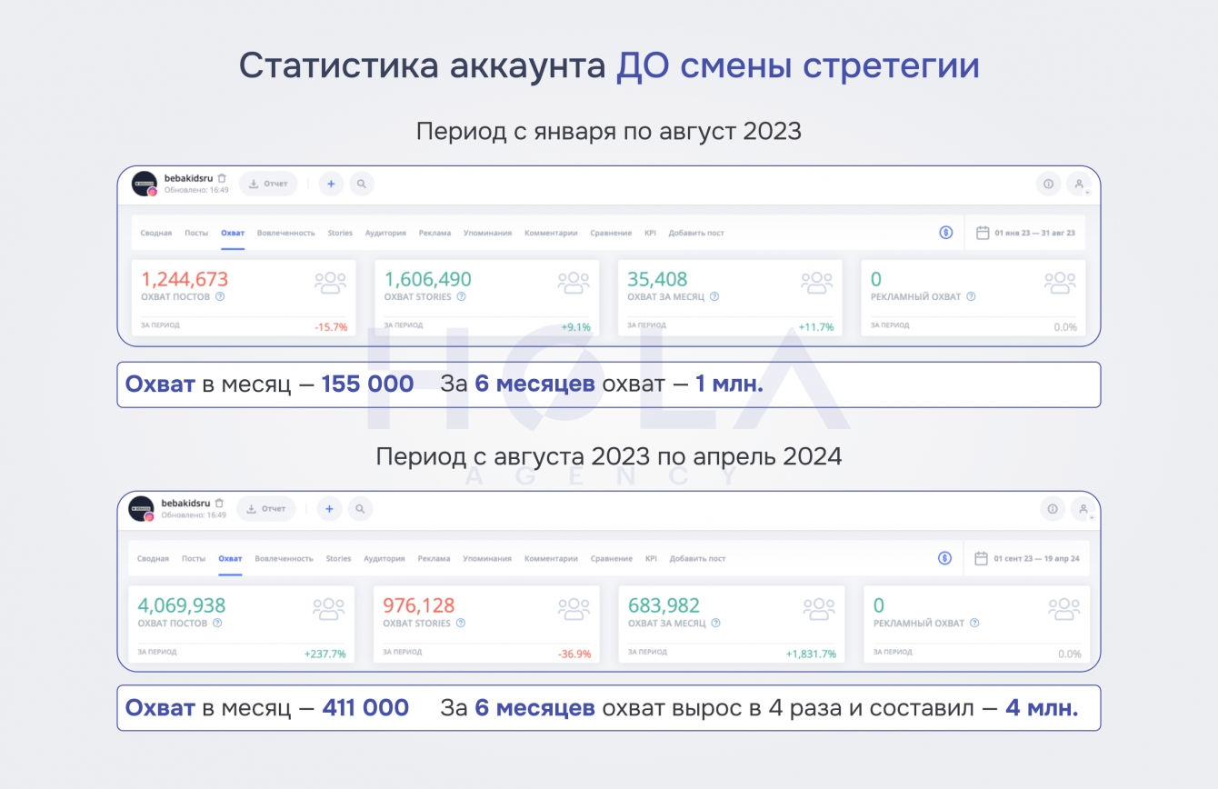 Именно сочетание этих двух методов — съёмка трендовых Reels с комбинацией сложного и простого монтажа и соавторство с амбассадорами и блогерами — помогло увеличить BebaKids охваты в 4 раза. Секрет экспоненциального роста узнаваемости в том, что контент мгновенно получал широкий охват от аудитории блогеров, алгоритмы площадки считывали активность и публикации выходили в топ рекомендаций новым пользователям. Рост охватов не ограничен, публикации могут находиться в топе месяцами. Это самый эффективный, быстрый и качественный способ выйти на новую целевую аудиторию бренда без привлечения рекламного бюджета.