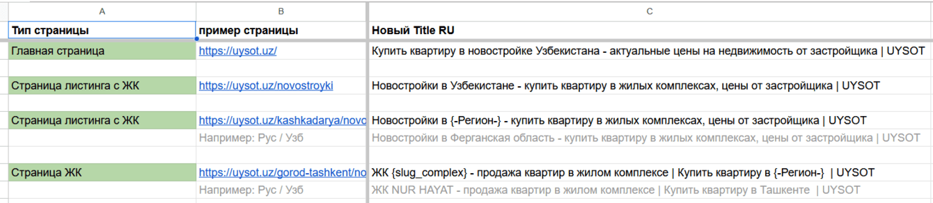 Заголовки страниц (теги ) были сформированы таким образом, чтобы максимально точно отражать содержание и релевантность по целевым запросам. Например, для страницы https://uysot.uz/andijan/kvartiri заголовок выглядел следующим образом: "Новые квартиры из Андижанской области".