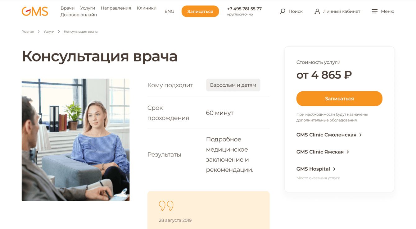 Чтобы сайт клиента соответствовал требованиям YMYL, мы выполнили аудит сайтов конкурентов. Проекты, которые находились в топе поисковых систем, имели особую структуру. Мы заимствовали основные идеи расположения блоков, чтобы внедрить их на сайт заказчика. По итогам аудита был создан отчет с требованиями к сайту GMS Clinic, который мы передали подрядчику на создание нового сайта. Дополнительно подготовили подробное ТЗ, в котором прописали этапы работ для минимизации потерь позиций и трафика после переноса сайта на новый движок.