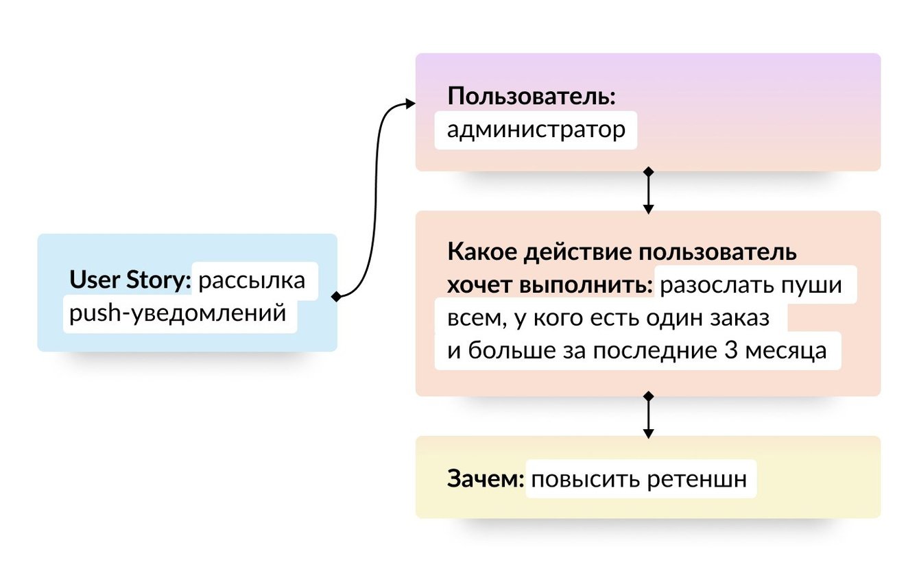 User Story необходимы для того, чтобы узнать, что нужно клиенту, найти его основные боли и их решения. Какие боли, например, решают push-уведомления? Они возвращают клиентов, напоминают о скидках и акциях, повышают количество взаимодействий с приложением и являются дополнительной точкой контакта с покупателями.