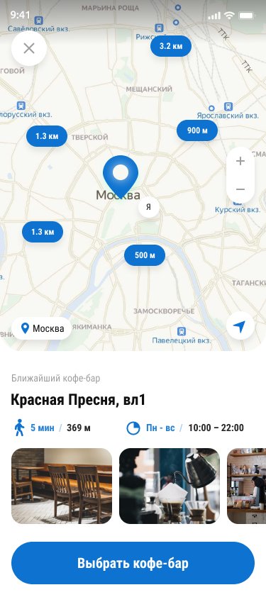 Если клиент хочет узнать, где находится ближайший кофе-бар, то приложение подскажет ему эту информацию: мы вытаскиваем из iiko список кофе-баров с адресами и определяем текущее местоположение пользователя и ближайшего кофе-бара. Затем эти данные передаем клиенту через приложение.